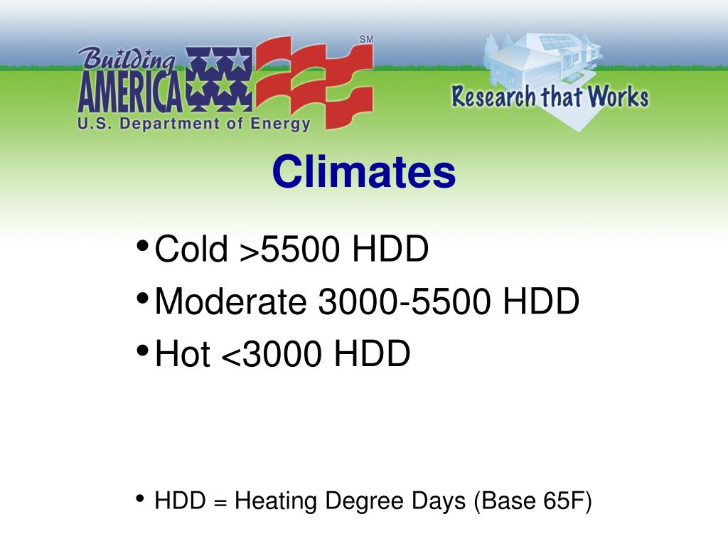 Climates • Cold >5500 HDD • Moderate 3000-5500 HDD • Hot <3000 HDD • HDD = Heating Degree Days (Base 65F)