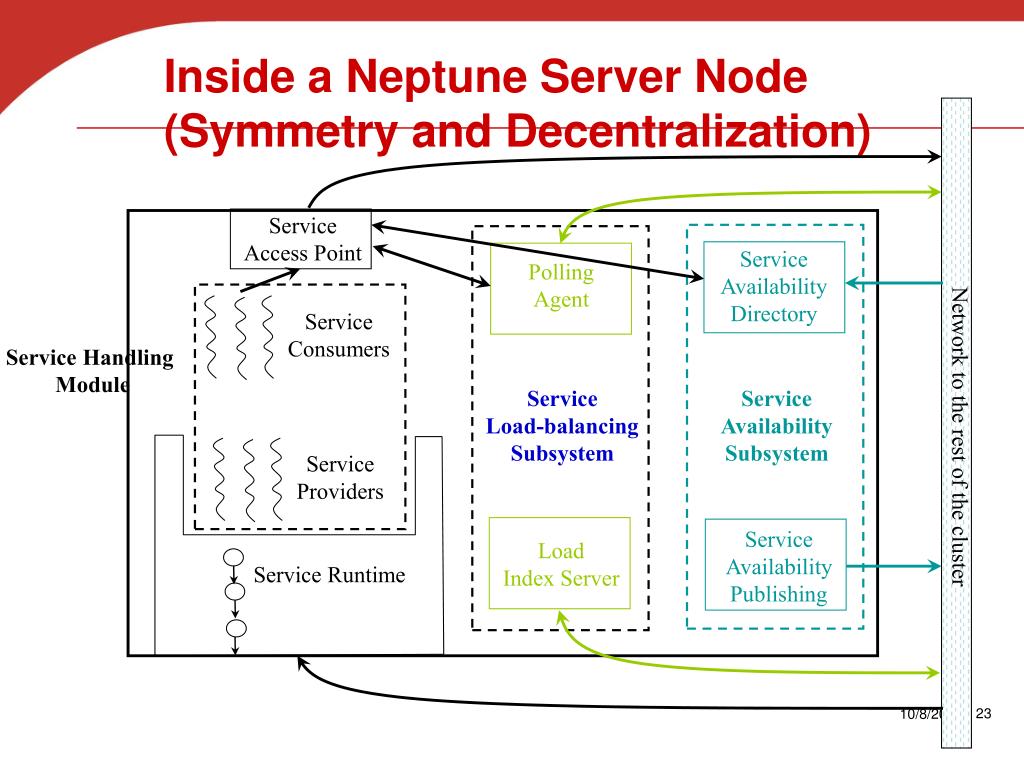 Network to the rest of the cluster Service Access Point Service Availability Directory Polling Agent Service Load-balancing Subsystem Service Availability Subsystem Service Providers Load Index Server Service Availability Publishing Service Runtime Inside a Neptune Server Node(Symmetry and Decentralization) Service Consumers Service Handling Module