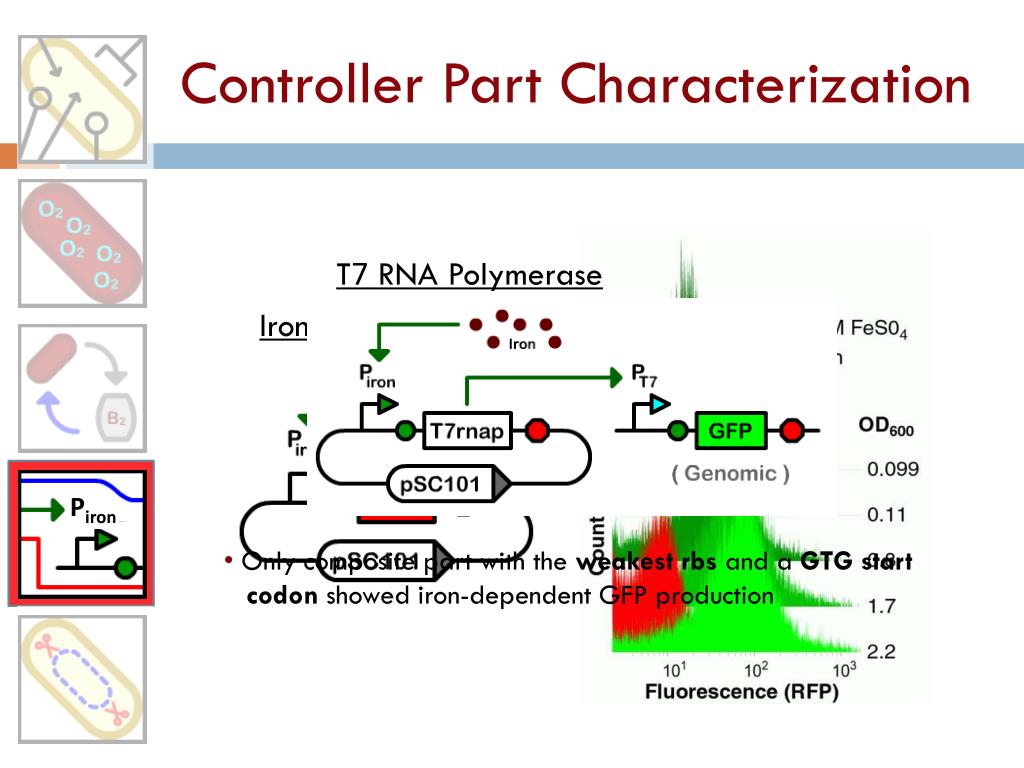 Controller Part Characterization T7 RNA Polymerase Iron Promoter, yfbE Piron • Only composite part with the weakest rbs and a GTG start • codon showed iron-dependent GFP production