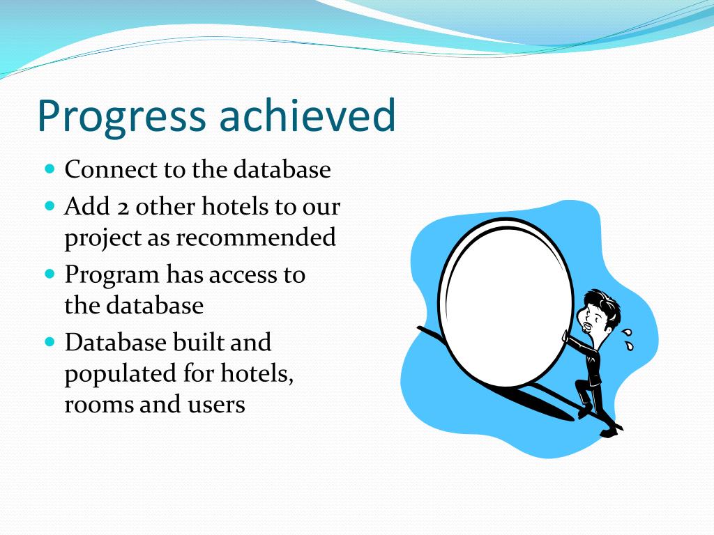 3. Progress achieved • Connect to the database • Add 2 other hotels to our project as recommended • Program has access to the database • Database built and populated for hotels, rooms and users