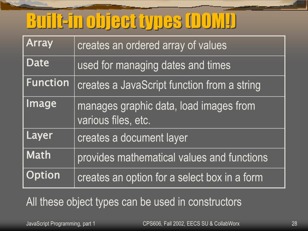 Built-in object types (DOM!) All these object types can be used in constructors CPS606, Fall 2002, EECS SU & CollabWorx