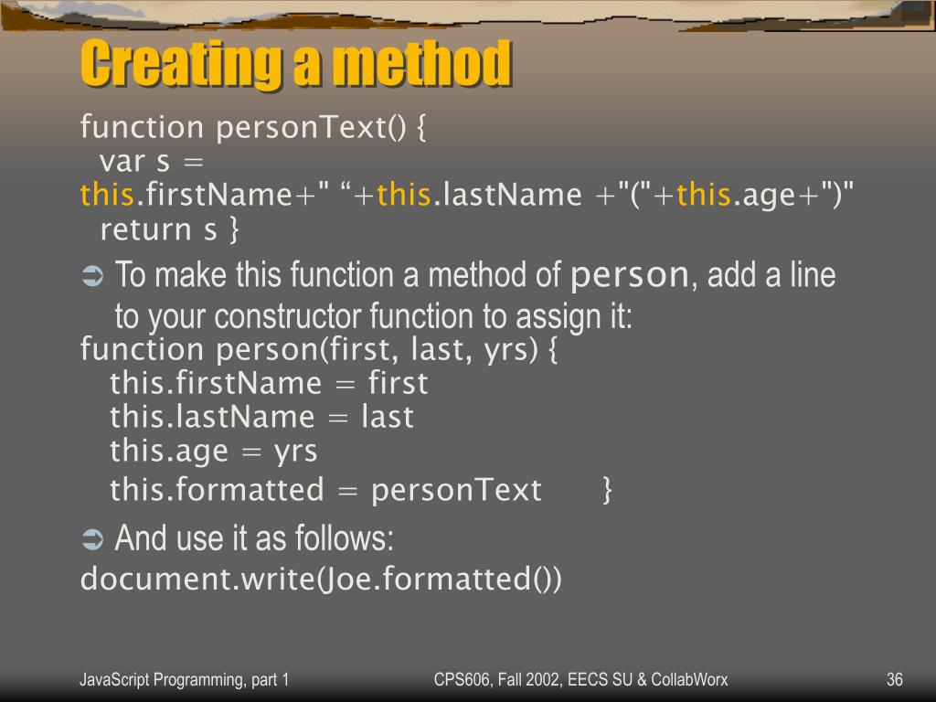 Creating a method function personText() { var s = this.firstName+" “+this.lastName +"("+this.age+")" return s } • To make this function a method of person, add a line to your constructor function to assign it: function person(first, last, yrs) { this.firstName = first this.lastName = last this.age = yrs this.formatted = personText } • And use it as follows: document.write(Joe.formatted()) CPS606, Fall 2002, EECS SU & CollabWorx