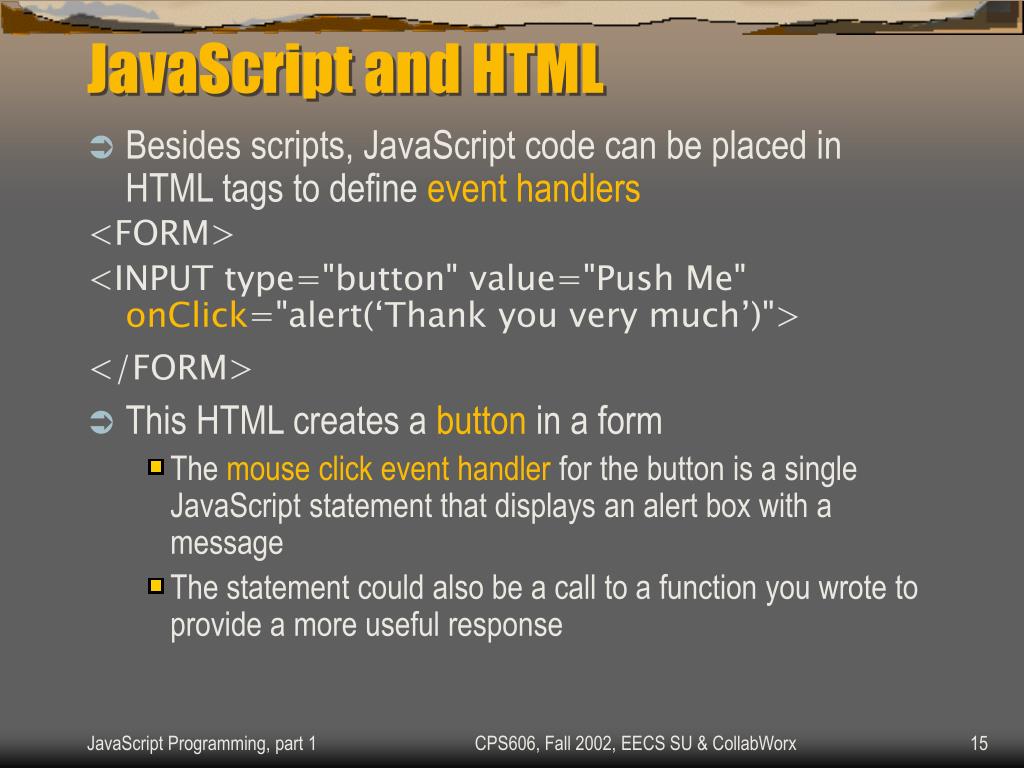 JavaScript and HTML • Besides scripts, JavaScript code can be placed in HTML tags to define event handlers <FORM> <INPUT type="button" value="Push Me" onClick="alert(‘Thank you very much’)"> </FORM> • This HTML creates a button in a form • The mouse click event handler for the button is a single JavaScript statement that displays an alert box with a message • The statement could also be a call to a function you wrote to provide a more useful response CPS606, Fall 2002, EECS SU & CollabWorx