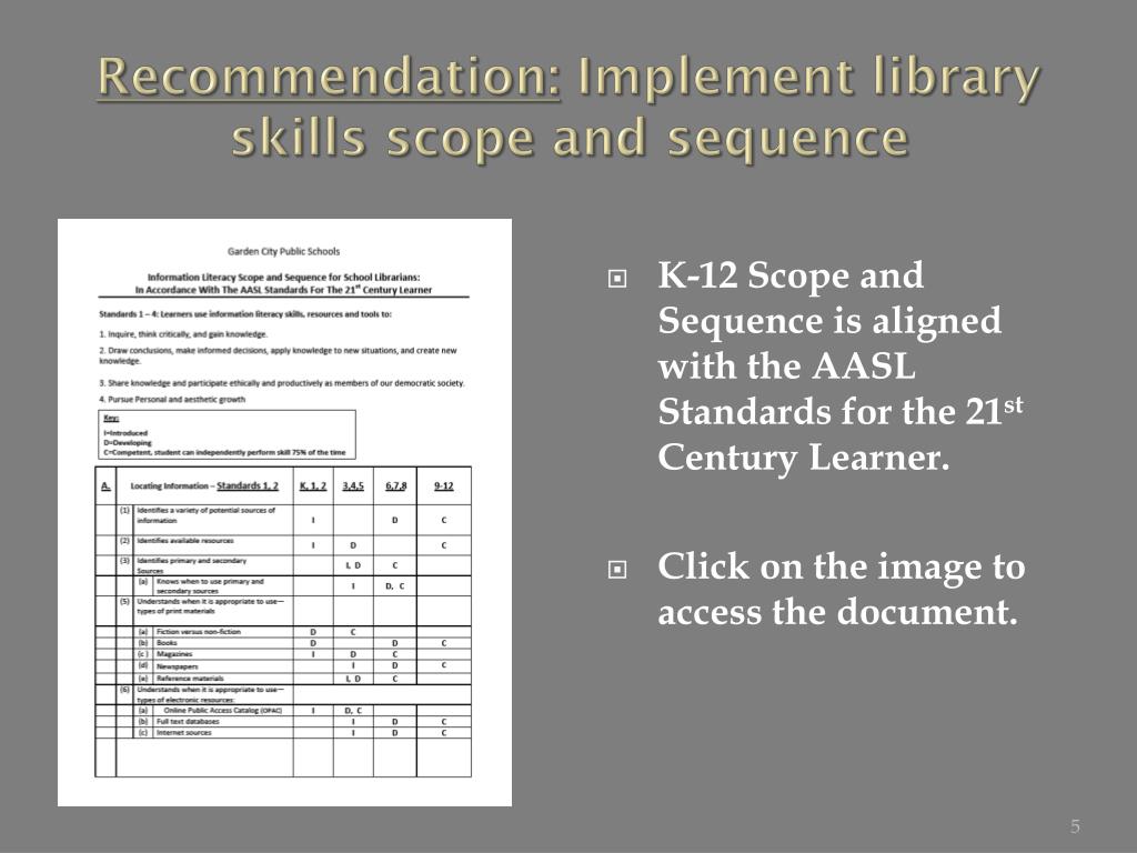 Recommendation: Implement library skills scope and sequence • K-12 Scope and Sequence is aligned with the AASL Standards for the 21st Century Learner. • Click on the image to access the document.