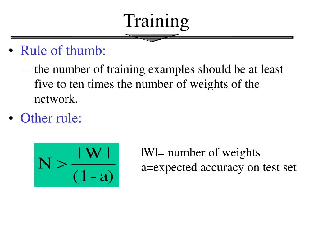 Training • Rule of thumb: • the number of training examples should be at least five to ten times the number of weights of the network. • Other rule: |W|= number of weights a=expected accuracy on test set