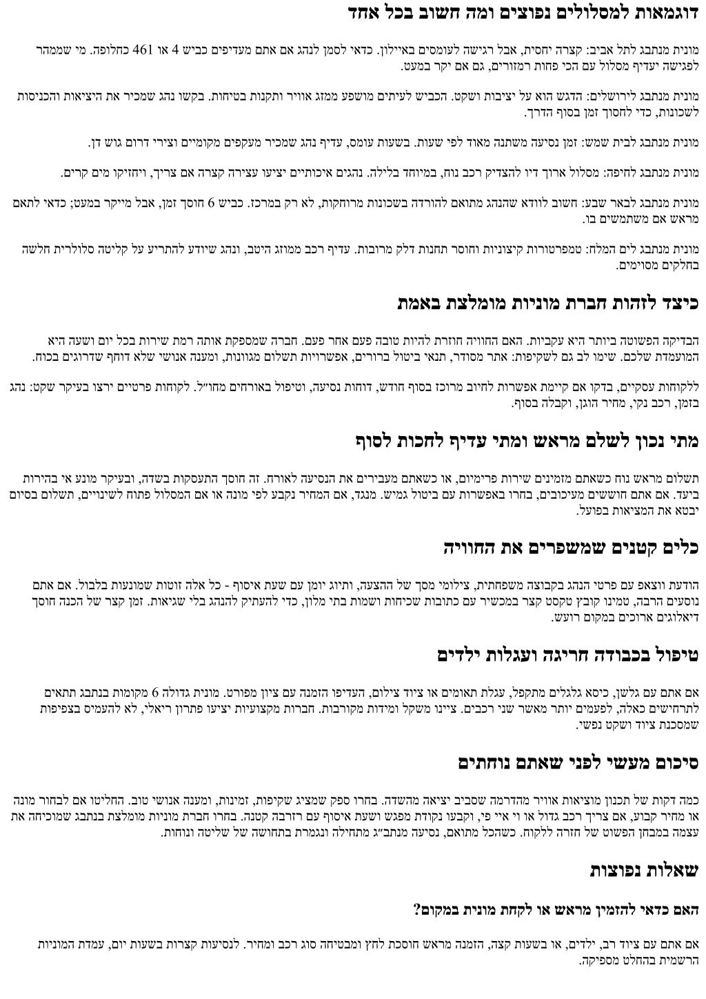 דחא לכב בושח המו םיצופנ םילולסמל תואמגוד רהממש ימ .הפולחכ 461 וא 4 שיבכ םיפידעמ םתא םא גהנל ןמסל יאדכ .ןולייאב םיסמועל השיגר לבא ,תיסחי הרצק :ביבא לתל גבתנמ תינומ .טעמב רקי םא םג ,םירוזמר תוחפ יכה םע לולסמ ףידעי השיגפל תוסינכהו תואיציה תא ריכמש גהנ ושקב .תוחיטב תונקתו ריווא גזממ עפשומ םיתיעל שיבכה .טקשו תוביצי לע אוה שגדה :םילשוריל גבתנמ תינומ .ךרדה ףוסב ןמז ךוסחל ידכ ,תונוכשל .ןד שוג םורד יריצו םיימוקמ םיפקעמ ריכמש גהנ ףידע ,סמוע תועשב .תועש יפל דואמ הנתשמ העיסנ ןמז :שמש תיבל גבתנמ תינומ .םירק םימ וקיזחיו ,ךירצ םא הרצק הריצע ועיצי םייתוכיא םיגהנ .הלילב דחוימב ,חונ בכר קידצהל ויד ךורא לולסמ :הפיחל גבתנמ תינומ םאתל יאדכ ;טעמב רקיימ לבא ,ןמז ךסוח 6 שיבכ .זכרמב קר אל ,תוקחורמ תונוכשב הדרוהל םאותמ גהנהש אדוול בושח :עבש ראבל גבתנמ תינומ .וב םישמתשמ םא שארמ השלח תירלולס הטילק לע עירתהל עדויש גהנו ,בטיה גזוממ בכר ףידע .תובורמ קלד תונחת רסוחו תוינוציק תורוטרפמט :חלמה םיל גבתנמ תינומ .םימיוסמ םיקלחב תמאב תצלמומ תוינומ תרבח תוהזל דציכ איה העשו םוי לכב תוריש תמר התוא תקפסמש הרבח .םעפ רחא םעפ הבוט תויהל תרזוח היווחה םאה .תויבקע איה רתויב הטושפה הקידבה .חוכב םיגורדש ףחוד אלש ישונא הנעמו ,תונווגמ םולשת תויורשפא ,םירורב לוטיב יאנת ,רדוסמ רתא :תופיקשל םג בל ומיש .םכלש תדמעומה גהנ :טקש רקיעב וצרי םייטרפ תוחוקל .ל״וחמ םיחרואב לופיטו ,העיסנ תוחוד ,שדוח ףוסב זכורמ בויחל תורשפא תמייק םא וקדב ,םייקסע תוחוקלל .ףוסב הלבקו ,ןגוה ריחמ ,יקנ בכר ,ןמזב ףוסל תוכחל ףידע יתמו שארמ םלשל ןוכנ יתמ תוריהב יא ענומ רקיעבו ,הדשב תוקסעתה ךסוח הז .חרואל העיסנה תא םיריבעמ םתאשכ וא ,םוימירפ תוריש םינימזמ םתאשכ חונ שארמ םולשת םויסב םולשת ,םייונישל חותפ לולסמה םא וא הנומ יפל עבקנ ריחמה םא ,דגנמ .שימג לוטיב םע תורשפאב ורחב ,םיבוכיעמ םיששוח םתא םא .דעיב .לעופב תואיצמה תא אטבי היווחה תא םירפשמש םינטק םילכ םתא םא .לובלב תוענומש תוטוז הלא לכ - ףוסיא תעש םע ןמוי גויתו ,העצהה לש ךסמ ימוליצ ,תיתחפשמ הצובקב גהנה יטרפ םע פאצוו תעדוה ךסוח הנכה לש רצק ןמז .תואיגש ילב גהנהל קיתעהל ידכ ,ןולמ יתב תומשו תוחיכש תובותכ םע רישכמב רצק טסקט ץבוק ונימט ,הברה םיעסונ .שעור םוקמב םיכורא םיגולאיד םידלי תולגעו הגירח הדובכב לופיט םיאתת גבתנב תומוקמ 6 הלודג תינומ .טרופמ ןויצ םע הנמזה ופידעה ,םוליצ דויצ וא םימואת תלגע ,לפקתמ םילגלג אסיכ ,ןשלג םע םתא םא תופיפצב סימעהל אל ,ילאיר ןורתפ ועיצי תויעוצקמ תורבח .תוברוקמ תודימו לקשמ ונייצ .םיבכר ינש רשאמ רתוי םימעפל ,הלאכ םישיחרתל .ישפנ טקשו דויצ תנכסמש םיתחונ םתאש ינפל ישעמ םוכיס הנומ רוחבל םא וטילחה .בוט ישונא הנעמו ,תונימז ,תופיקש גיצמש קפס ורחב .הדשהמ האיצי ביבסש המרדהמ ריווא תואיצומ ןונכת לש תוקד המכ תא החיכומש גבתנב תצלמומ תוינומ תרבח ורחב .הנטק הברזר םע ףוסיא תעשו שגפמ תדוקנ ועבקו ,יפ ייא יו וא לודג בכר ךירצ םא ,עובק ריחמ וא .תוחונו הטילש לש השוחתב תרמגנו הליחתמ ג״בתנמ העיסנ ,םאותמ לכהשכ .חוקלל הרזח לש טושפה ןחבמב המצע תוצופנ תולאש ?םוקמב תינומ תחקל וא שארמ ןימזהל יאדכ םאה תוינומה תדמע ,םוי תועשב תורצק תועיסנל .ריחמו בכר גוס החיטבמו ץחל תכסוח שארמ הנמזה ,הצק תועשב וא ,םידלי ,בר דויצ םע םתא םא .הקיפסמ טלחהב תימשרה