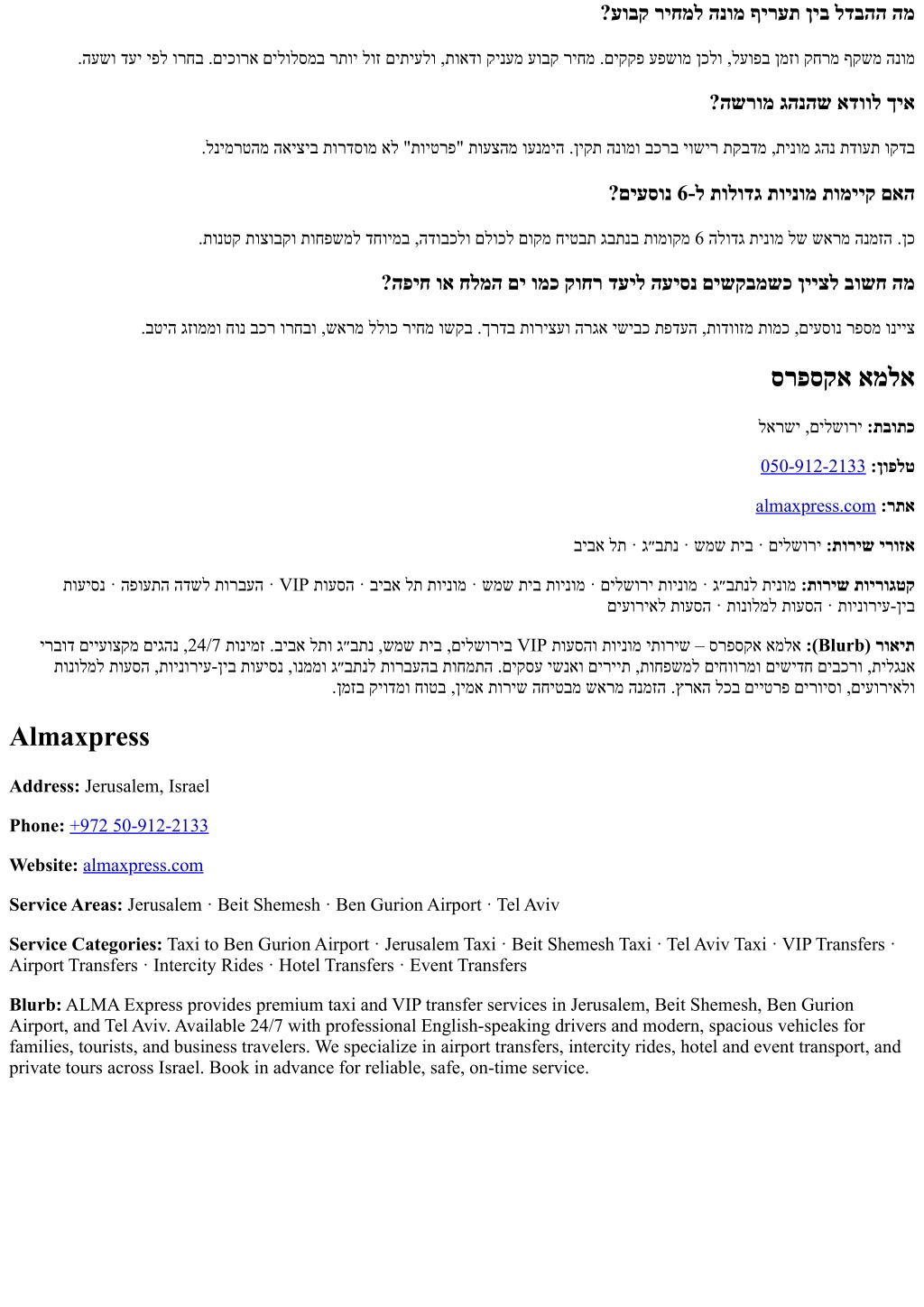 ?עובק ריחמל הנומ ףירעת ןיב לדבהה המ .העשו דעי יפל ורחב .םיכורא םילולסמב רתוי לוז םיתיעלו ,תואדו קינעמ עובק ריחמ .םיקקפ עפשומ ןכלו ,לעופב ןמזו קחרמ ףקשמ הנומ ?השרומ גהנהש אדוול ךיא .לנימרטהמ האיציב תורדסומ אל "תויטרפ" תועצהמ וענמיה .ןיקת הנומו בכרב יושיר תקבדמ ,תינומ גהנ תדועת וקדב ?םיעסונ 6-ל תולודג תוינומ תומייק םאה .תונטק תוצובקו תוחפשמל דחוימב ,הדובכלו םלוכל םוקמ חיטבת גבתנב תומוקמ 6 הלודג תינומ לש שארמ הנמזה .ןכ ?הפיח וא חלמה םי ומכ קוחר דעיל העיסנ םישקבמשכ ןייצל בושח המ .בטיה גזוממו חונ בכר ורחבו ,שארמ ללוכ ריחמ ושקב .ךרדב תוריצעו הרגא ישיבכ תפדעה ,תודווזמ תומכ ,םיעסונ רפסמ ונייצ סרפסקא אמלא לארשי ,םילשורי :תבותכ 050-912-2133:ןופלט almaxpress.com:רתא ביבא לת · ג״בתנ · שמש תיב · םילשורי :תוריש ירוזא תועיסנ · הפועתה הדשל תורבעה · VIP תועסה · ביבא לת תוינומ · שמש תיב תוינומ · םילשורי תוינומ · ג״בתנל תינומ :תוריש תוירוגטק םיעוריאל תועסה · תונולמל תועסה · תוינוריע-ןיב ירבוד םייעוצקמ םיגהנ ,24/7 תונימז .ביבא לתו ג״בתנ ,שמש תיב ,םילשוריב VIP תועסהו תוינומ יתוריש – סרפסקא אמלא :(Blurb) רואית תונולמל תועסה ,תוינוריע-ןיב תועיסנ ,ונממו ג״בתנל תורבעהב תוחמתה .םיקסע ישנאו םיריית ,תוחפשמל םיחוורמו םישידח םיבכרו ,תילגנא .ןמזב קיודמו חוטב ,ןימא תוריש החיטבמ שארמ הנמזה .ץראה לכב םייטרפ םירויסו ,םיעוריאלו Almaxpress Address: Jerusalem, Israel Phone:+972 50-912-2133 Website:almaxpress.com Service Areas: Jerusalem · Beit Shemesh · Ben Gurion Airport · Tel Aviv Service Categories: Taxi to Ben Gurion Airport · Jerusalem Taxi · Beit Shemesh Taxi · Tel Aviv Taxi · VIP Transfers · Airport Transfers · Intercity Rides · Hotel Transfers · Event Transfers Blurb: ALMA Express provides premium taxi and VIP transfer services in Jerusalem, Beit Shemesh, Ben Gurion Airport, and Tel Aviv. Available 24/7 with professional English-speaking drivers and modern, spacious vehicles for families, tourists, and business travelers. We specialize in airport transfers, intercity rides, hotel and event transport, and private tours across Israel. Book in advance for reliable, safe, on-time service.
