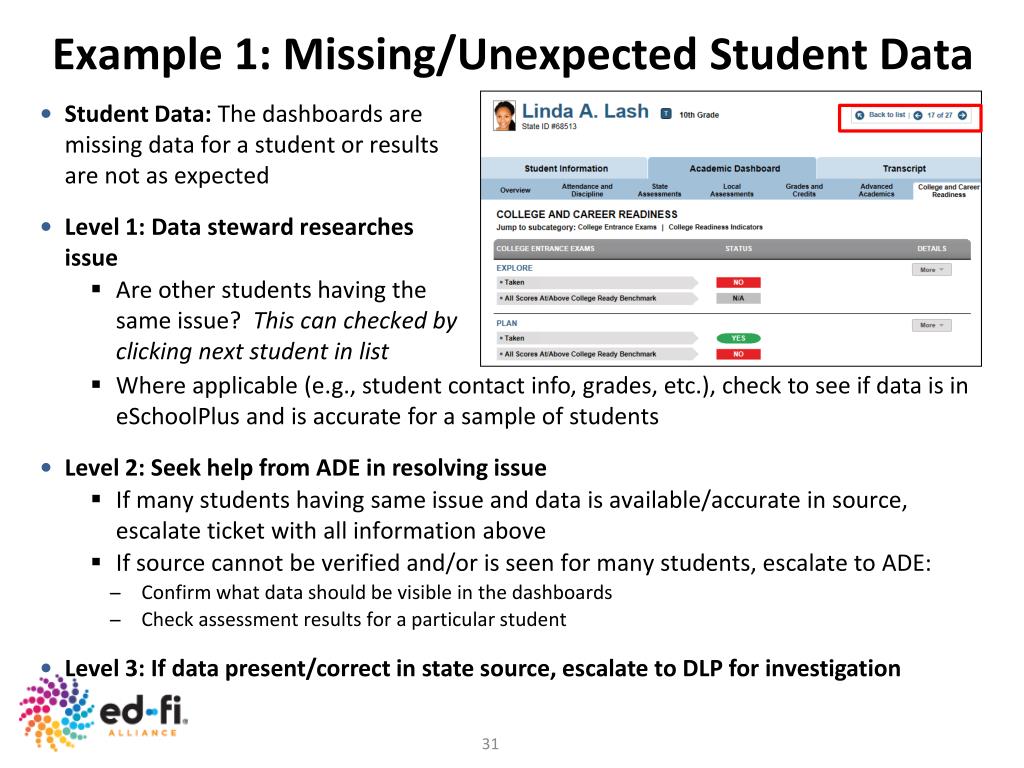 Example 1: Missing/Unexpected Student Data • Student Data: The dashboards are missing data for a student or results are not as expected • Level 1: Data steward researches issue • Are other students having the same issue? This can checked by clicking next student in list • Where applicable (e.g., student contact info, grades, etc.), check to see if data is in eSchoolPlus and is accurate for a sample of students • Level 2: Seek help from ADE in resolving issue • If many students having same issue and data is available/accurate in source, escalate ticket with all information above • If source cannot be verified and/or is seen for many students, escalate to ADE: • Confirm what data should be visible in the dashboards • Check assessment results for a particular student • Level 3: If data present/correct in state source, escalate to DLP for investigation