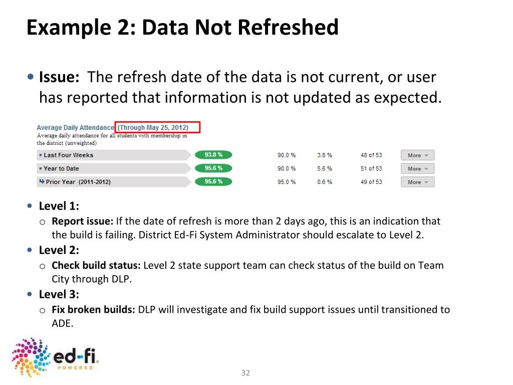 Example 2: Data Not Refreshed • Issue: The refresh date of the data is not current, or user has reported that information is not updated as expected. • Level 1: • Report issue: If the date of refresh is more than 2 days ago, this is an indication that the build is failing. District Ed-Fi System Administrator should escalate to Level 2. • Level 2: • Check build status: Level 2 state support team can check status of the build on Team City through DLP. • Level 3: • Fix broken builds: DLP will investigate and fix build support issues until transitioned to ADE.