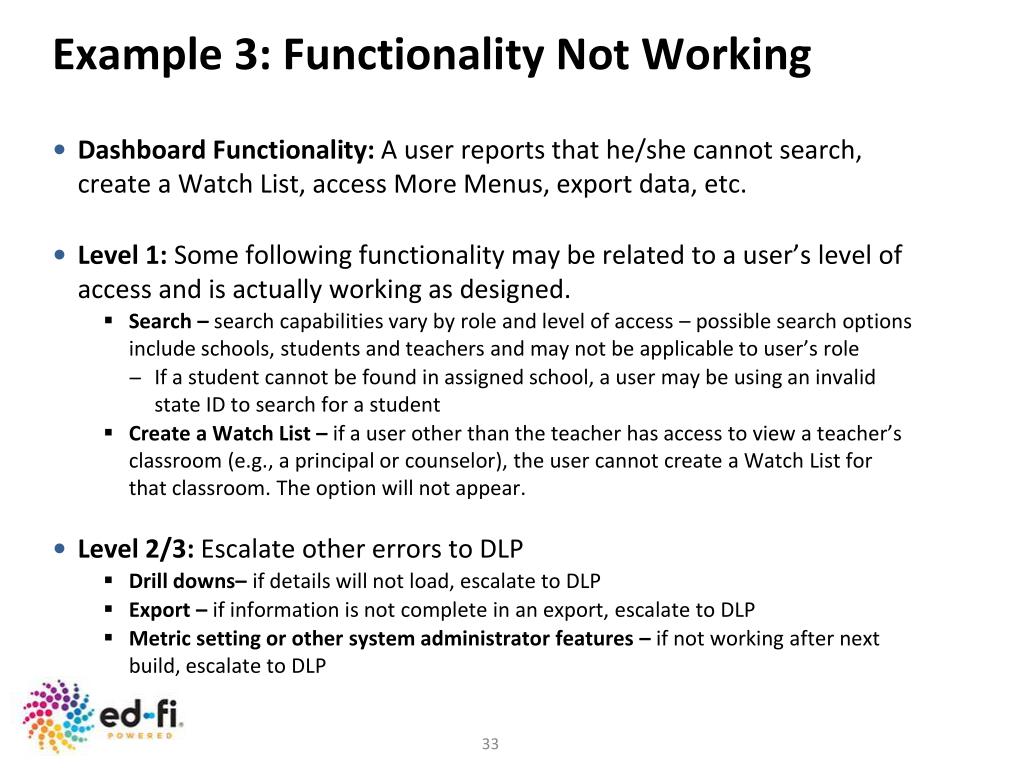 Example 3: Functionality Not Working • Dashboard Functionality: A user reports that he/she cannot search, create a Watch List, access More Menus, export data, etc. • Level 1: Some following functionality may be related to a user’s level of access and is actually working as designed. • Search – search capabilities vary by role and level of access – possible search options include schools, students and teachers and may not be applicable to user’s role • If a student cannot be found in assigned school, a user may be using an invalid state ID to search for a student • Create a Watch List – if a user other than the teacher has access to view a teacher’s classroom (e.g., a principal or counselor), the user cannot create a Watch List for that classroom. The option will not appear. • Level 2/3: Escalate other errors to DLP • Drill downs– if details will not load, escalate to DLP • Export – if information is not complete in an export, escalate to DLP • Metric setting or other system administrator features – if not working after next build, escalate to DLP