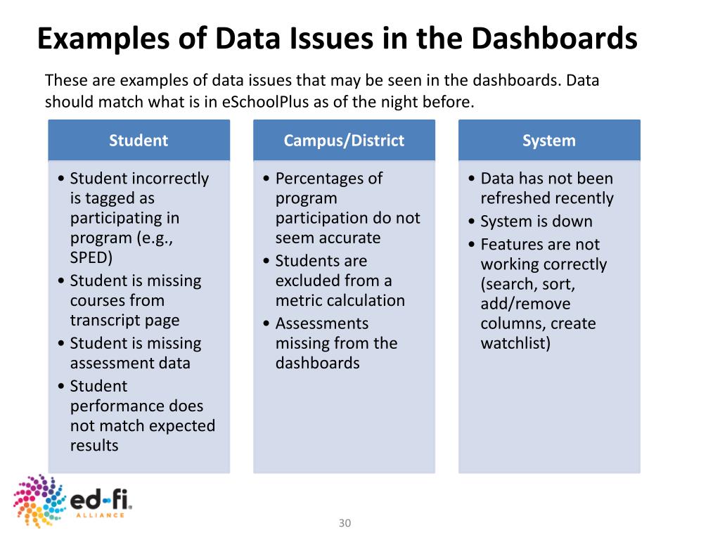 Examples of Data Issues in the Dashboards These are examples of data issues that may be seen in the dashboards. Data should match what is in eSchoolPlus as of the night before.