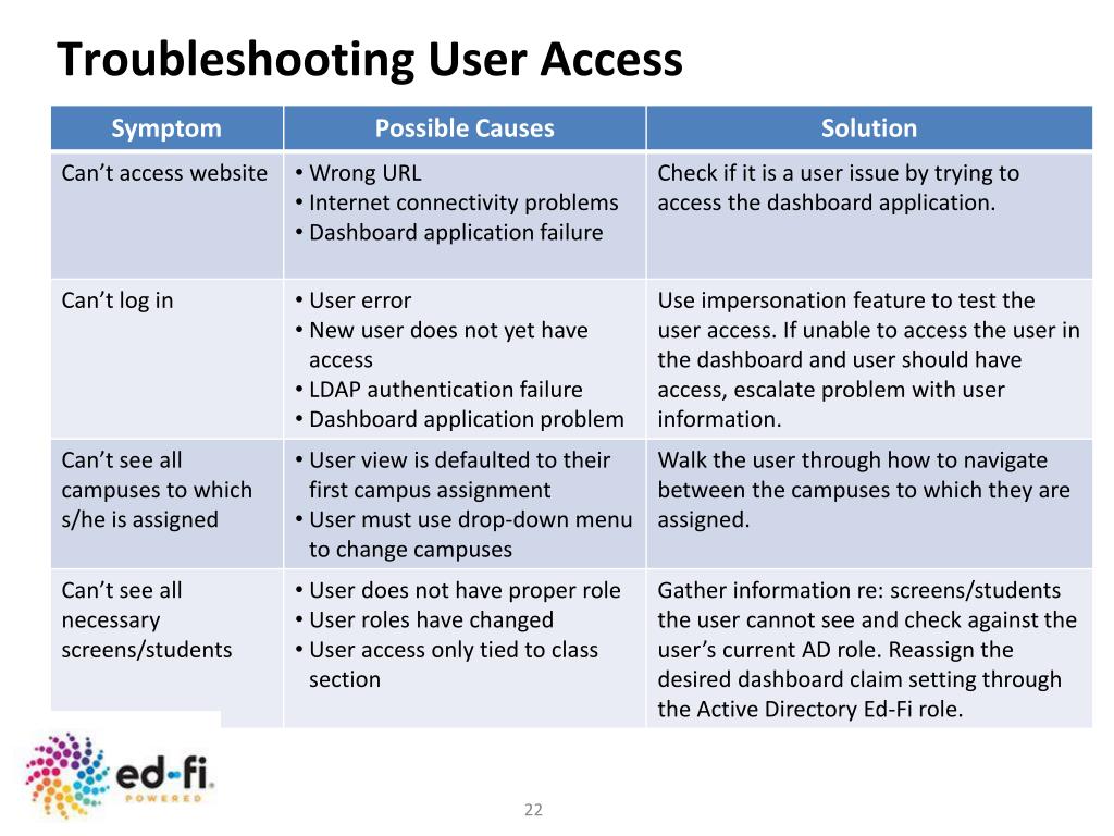 User Access Verification • Users will login to the dashboards using their eSchoolPlus Teacher Access Center (TAC) username and password. • User access must be verified before training to ensure success • In addition to encouraging users to check logins before training, SystemAdministrators can impersonate users to test logins • District team can also send an e-mail asking users to test their own login in advance of training • Experience suggests that dashboard training will be more effective if users have access to their own students’ data during training