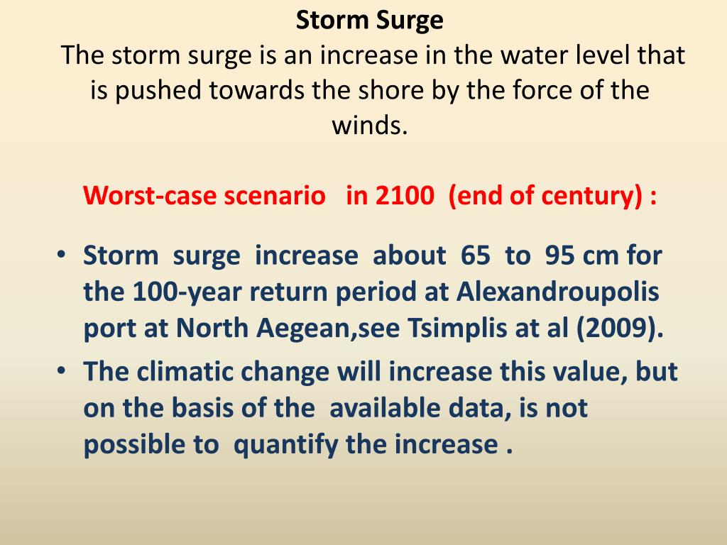 Storm Surge The storm surge is an increase in the water level that is pushed towards the shore by the force of the winds. Worst-case scenario in 2100 (end of century) : • Storm surge increase about 65 to 95 cm for the 100-year return period at Alexandroupolis port at North Aegean,seeTsimplis at al (2009). • The climatic change will increase this value, but on the basis of the available data, is not possible to quantify the increase .