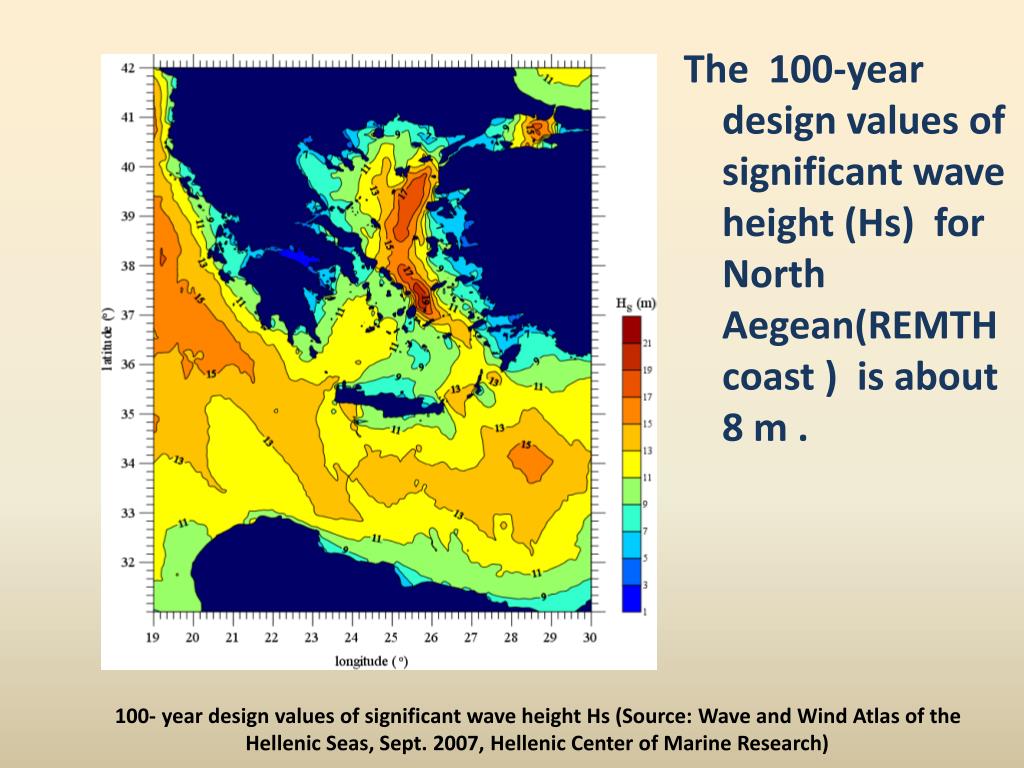 100- year design values of significant wave height Hs (Source: Wave and Wind Atlas of the Hellenic Seas, Sept. 2007, Hellenic Center of Marine Research) The 100-year design values of significant wave height (Ηs) for North Aegean(REMTH coast ) is about 8 m .
