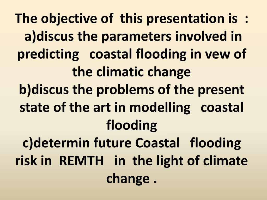 The objective of this presentation is : a)discus the parameters involved in predicting coastal flooding in vew of the climatic changeb)discus the problems of the present state of the art in modelling coastal floodingc)determin future Coastal flooding risk in REMTH in the light of climate change .