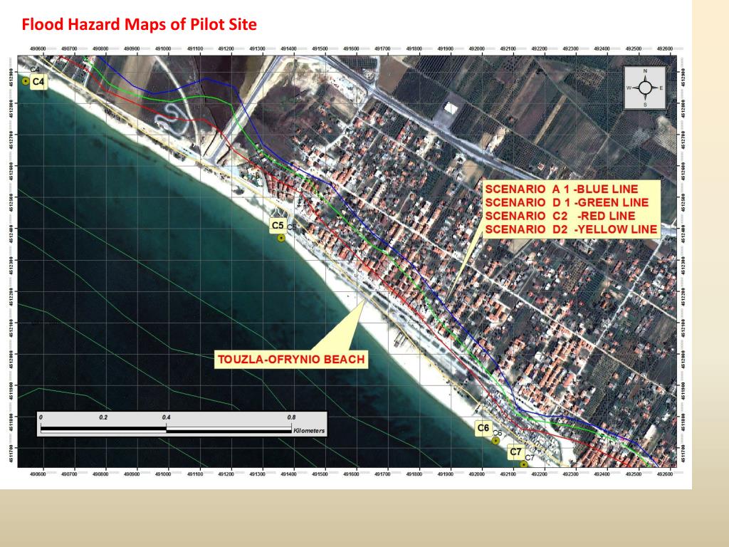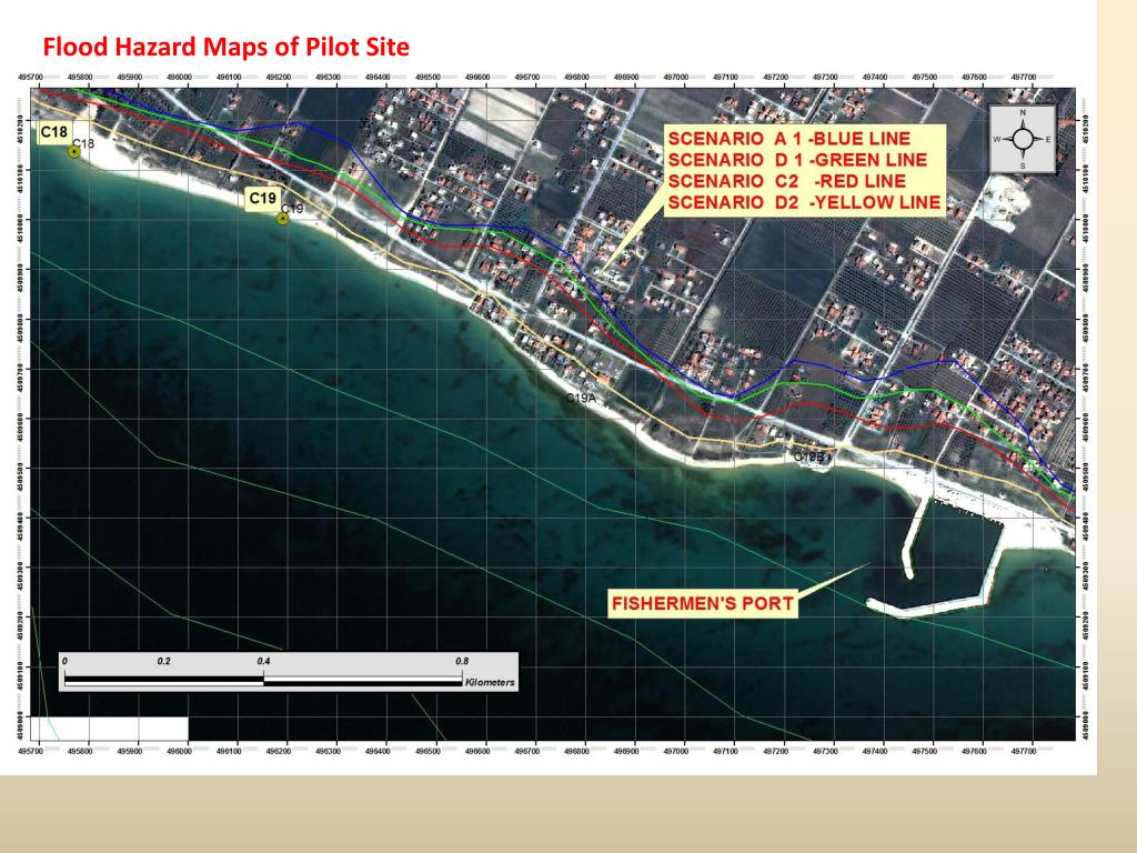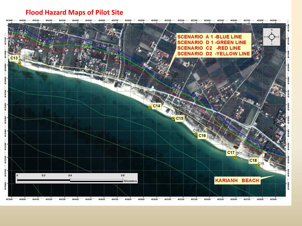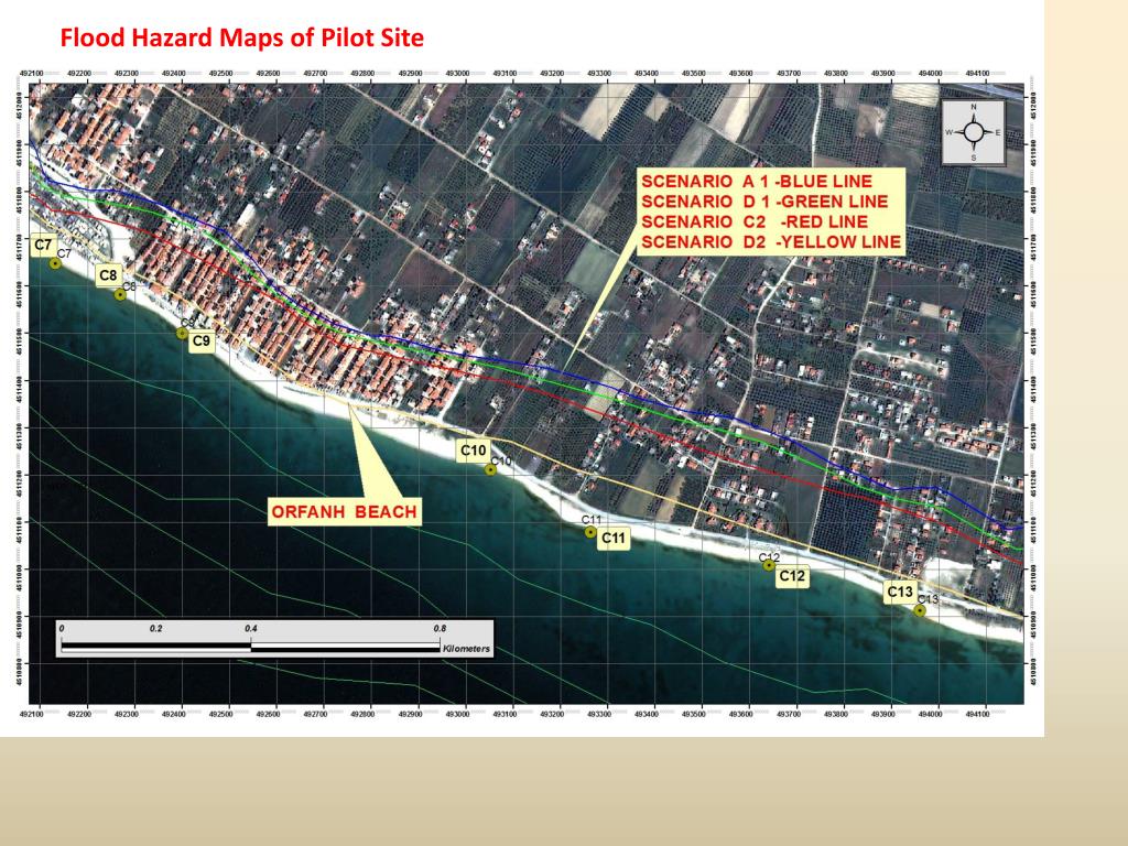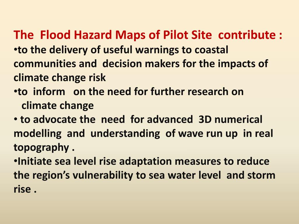 The Flood Hazard Maps of Pilot Site contribute : • to the delivery of useful warnings to coastal communities and decision makers for the impacts of climate change risk • to inform on the need for further research on • climate change • to advocate the need for advanced 3D numerical modelling and understanding of wave run up in real topography . • Initiate sea level rise adaptation measures to reduce the region’s vulnerability to sea water level and storm rise .