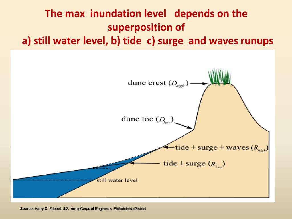 The max inundation level depends on the superposition of a) still water level, b) tide c) surge and waves runups . Source: Harry C. Friebel, U.S. Army Corps of Engineers Philadelphia District
