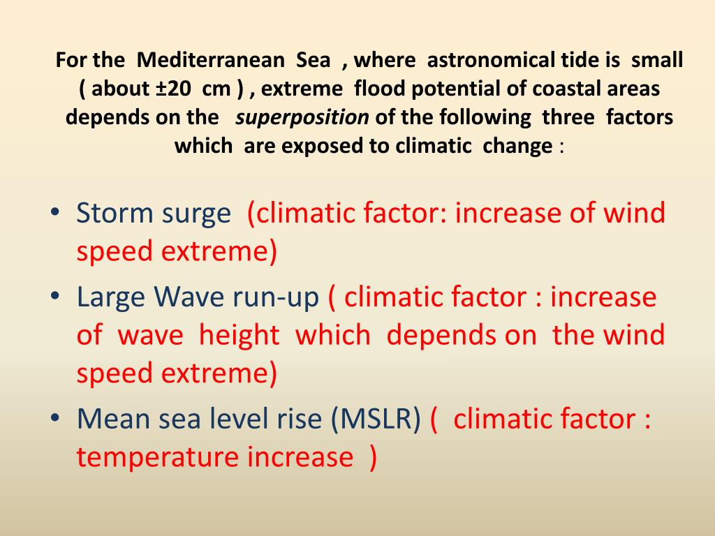 For the Mediterranean Sea , where astronomical tide is small ( about ±20 cm ) , extreme flood potential of coastal areas depends on the superposition of the following three factors which are exposed to climatic change : • Storm surge (climatic factor: increase of wind speed extreme) • Large Wave run-up ( climatic factor : increase of wave height which depends on the wind speed extreme) • Mean sea level rise (MSLR) ( climatic factor : temperature increase )