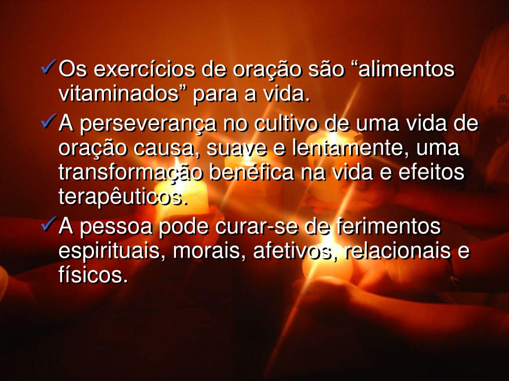 Os exercícios de oração são “alimentos vitaminados” para a vida. • A perseverança no cultivo de uma vida de oração causa, suave e lentamente, uma transformação benéfica na vida e efeitos terapêuticos. • A pessoa pode curar-se de ferimentos espirituais, morais, afetivos, relacionais e físicos.