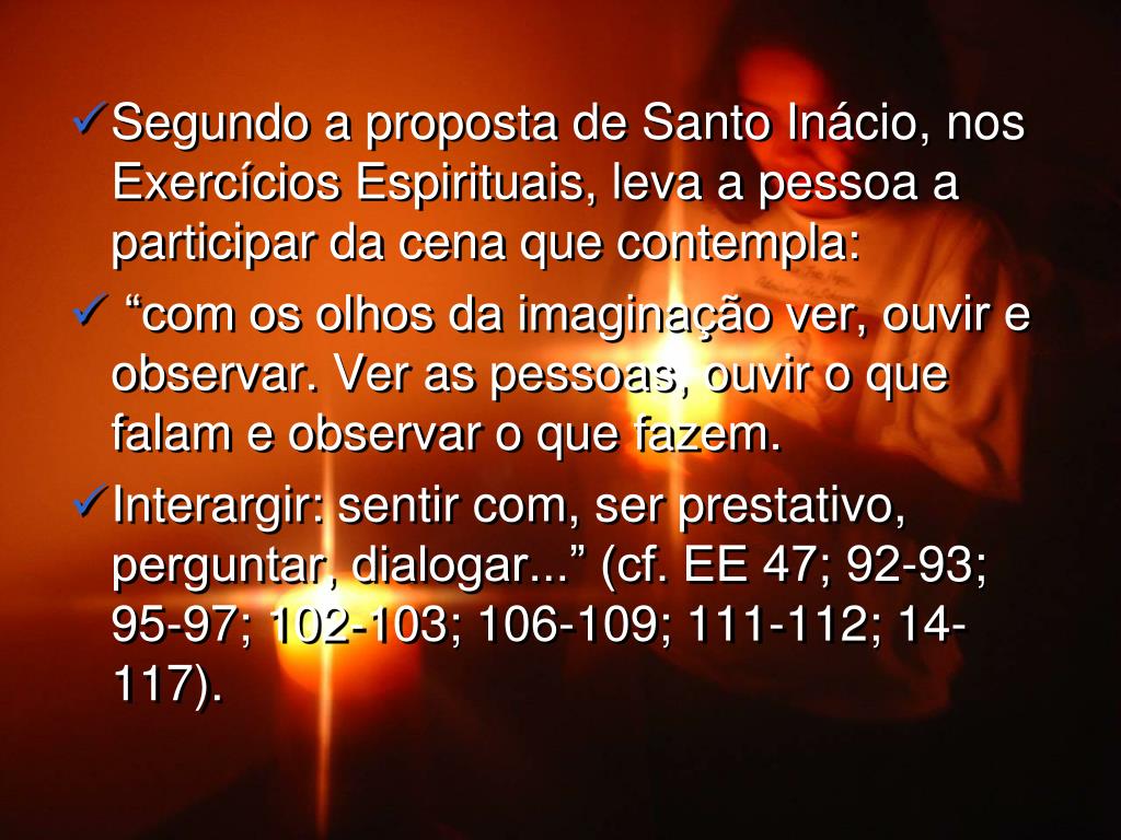 Segundo a proposta de Santo Inácio, nos Exercícios Espirituais, leva a pessoa a participar da cena que contempla: • “com os olhos da imaginação ver, ouvir e observar. Ver as pessoas, ouvir o que falam e observar o que fazem. • Interargir: sentir com, ser prestativo, perguntar, dialogar...” (cf. EE 47; 92-93; 95-97; 102-103; 106-109; 111-112; 14-117).