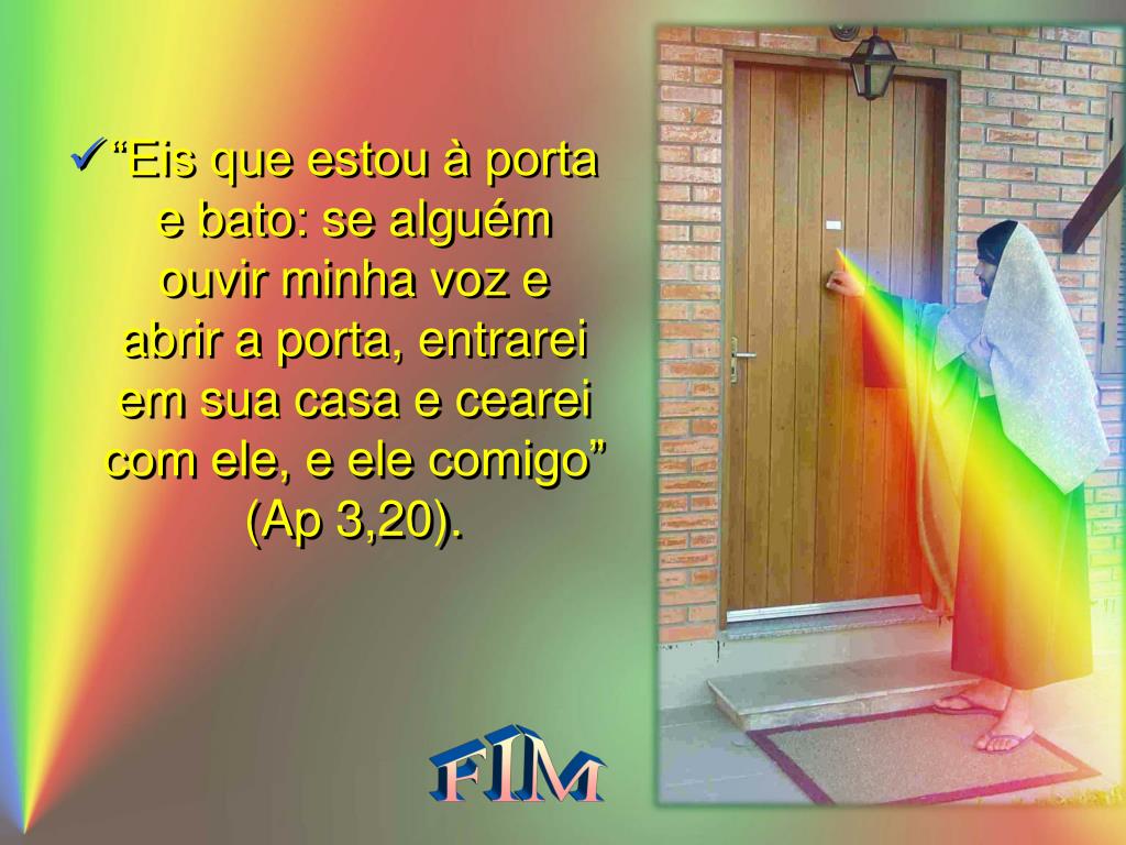 “Eis que estou à porta e bato: se alguém ouvir minha voz e abrir a porta, entrarei em sua casa e cearei com ele, e ele comigo” (Ap 3,20). FIM