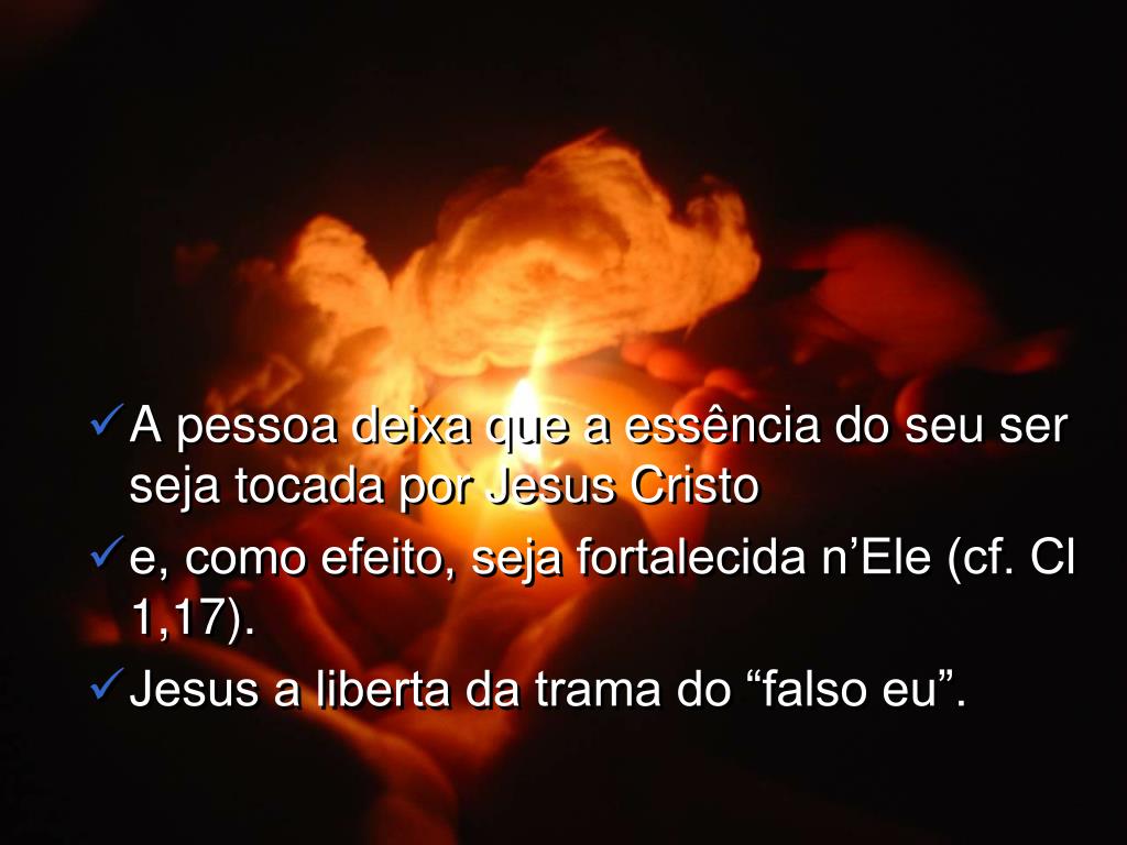 A pessoa deixa que a essência do seu ser seja tocada por Jesus Cristo • e, como efeito, seja fortalecida n’Ele (cf. Cl 1,17). • Jesus a liberta da trama do “falso eu”.