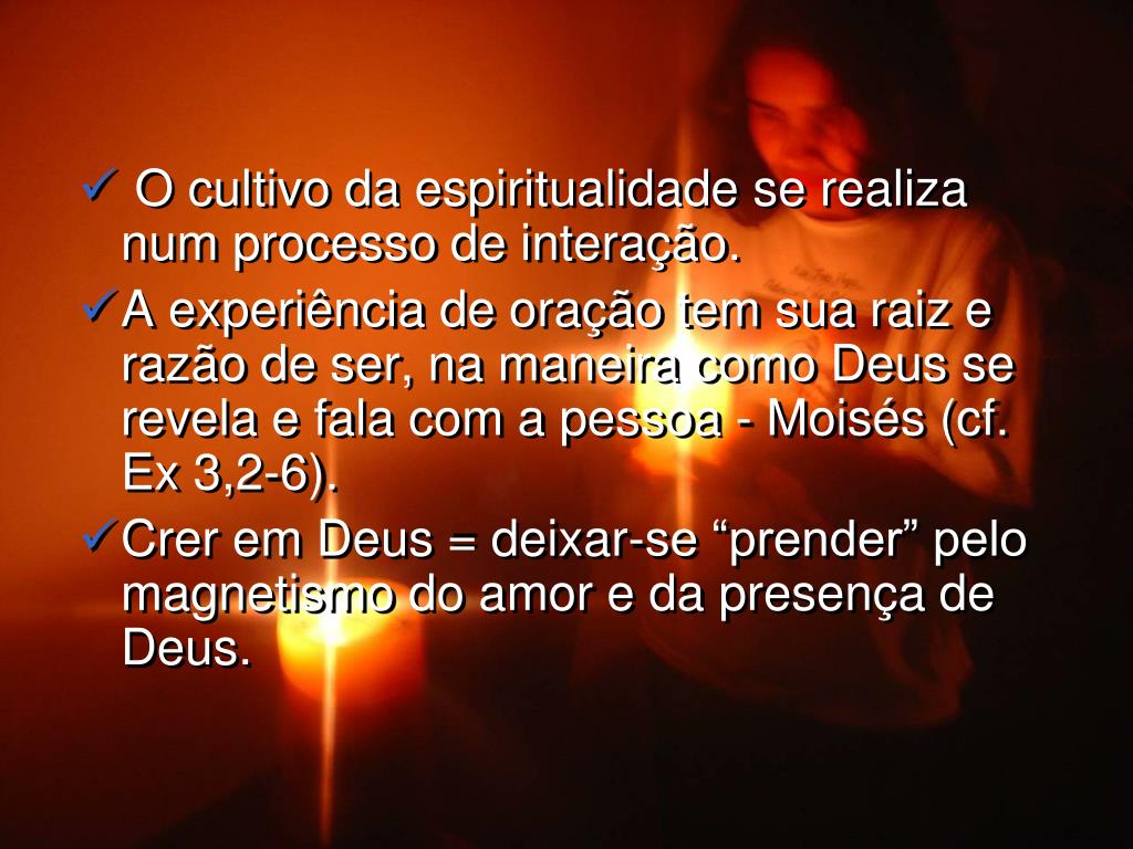 O cultivo da espiritualidade se realiza num processo de interação. • A experiência de oração tem sua raiz e razão de ser, na maneira como Deus se revela e fala com a pessoa - Moisés (cf. Ex 3,2-6). • Crer em Deus = deixar-se “prender” pelo magnetismo do amor e da presença de Deus.