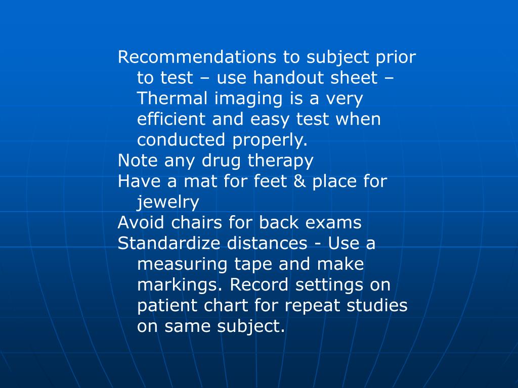 Recommendations to subject prior to test – use handout sheet – Thermal imaging is a very efficient and easy test when conducted properly. Note any drug therapy Have a mat for feet & place for jewelry Avoid chairs for back exams Standardize distances - Use a measuring tape and make markings. Record settings on patient chart for repeat studies on same subject.
