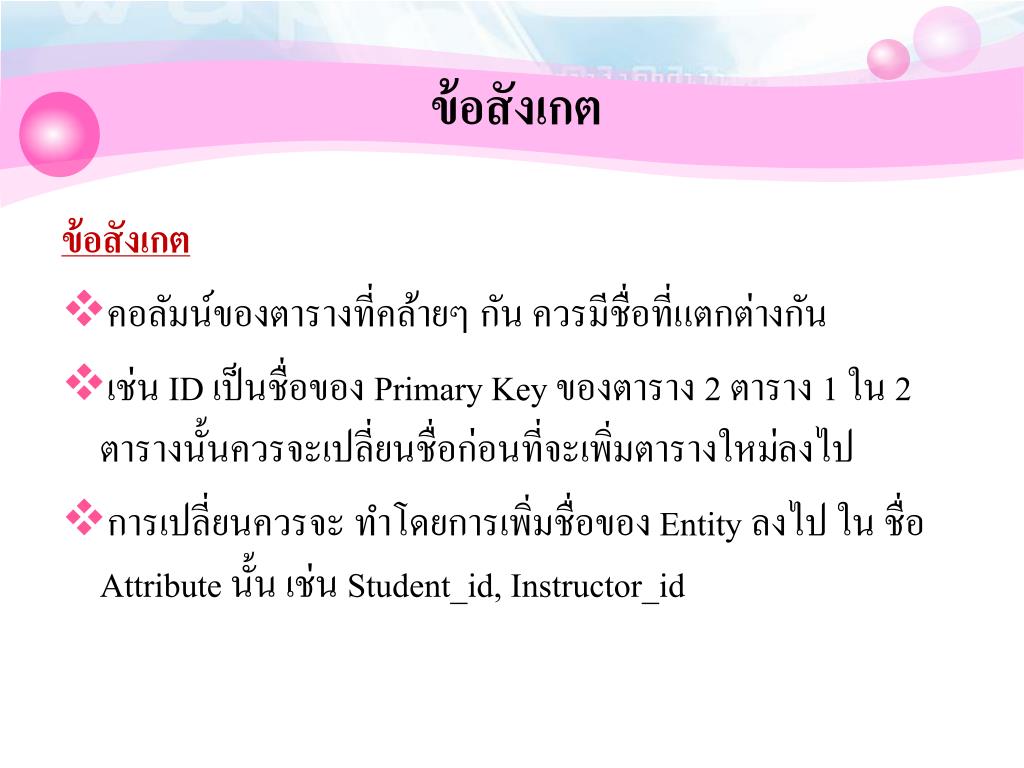 ข้อสังเกต ข้อสังเกต • คอลัมน์ของตารางที่คล้ายๆ กัน ควรมีชื่อที่แตกต่างกัน • เช่น ID เป็นชื่อของ Primary Key ของตาราง 2 ตาราง 1 ใน 2 ตารางนั้นควรจะเปลี่ยนชื่อก่อนที่จะเพิ่มตารางใหม่ลงไป • การเปลี่ยนควรจะ ทำโดยการเพิ่มชื่อของ Entity ลงไป ใน ชื่อ Attribute นั้น เช่น Student_id, Instructor_id