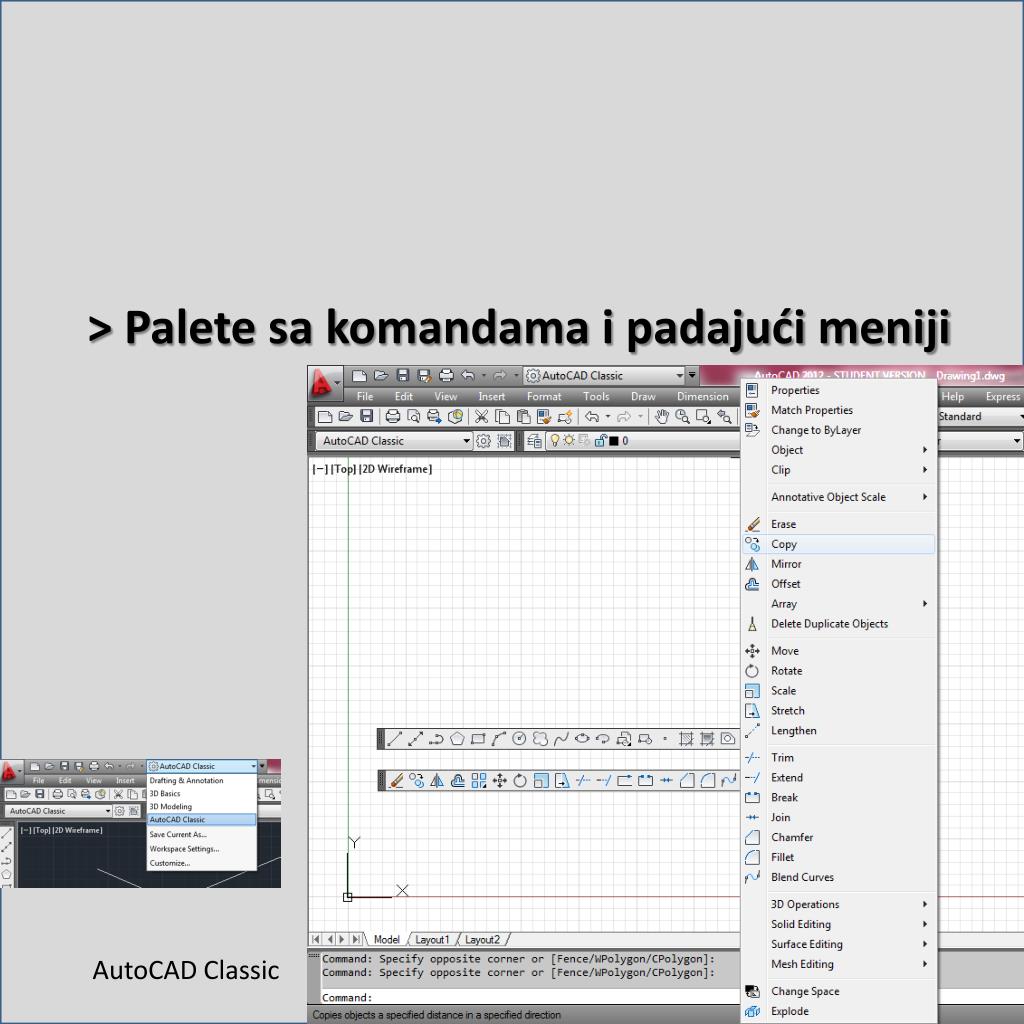 > Palete sa komandama i padajući meniji AutoCAD Classic