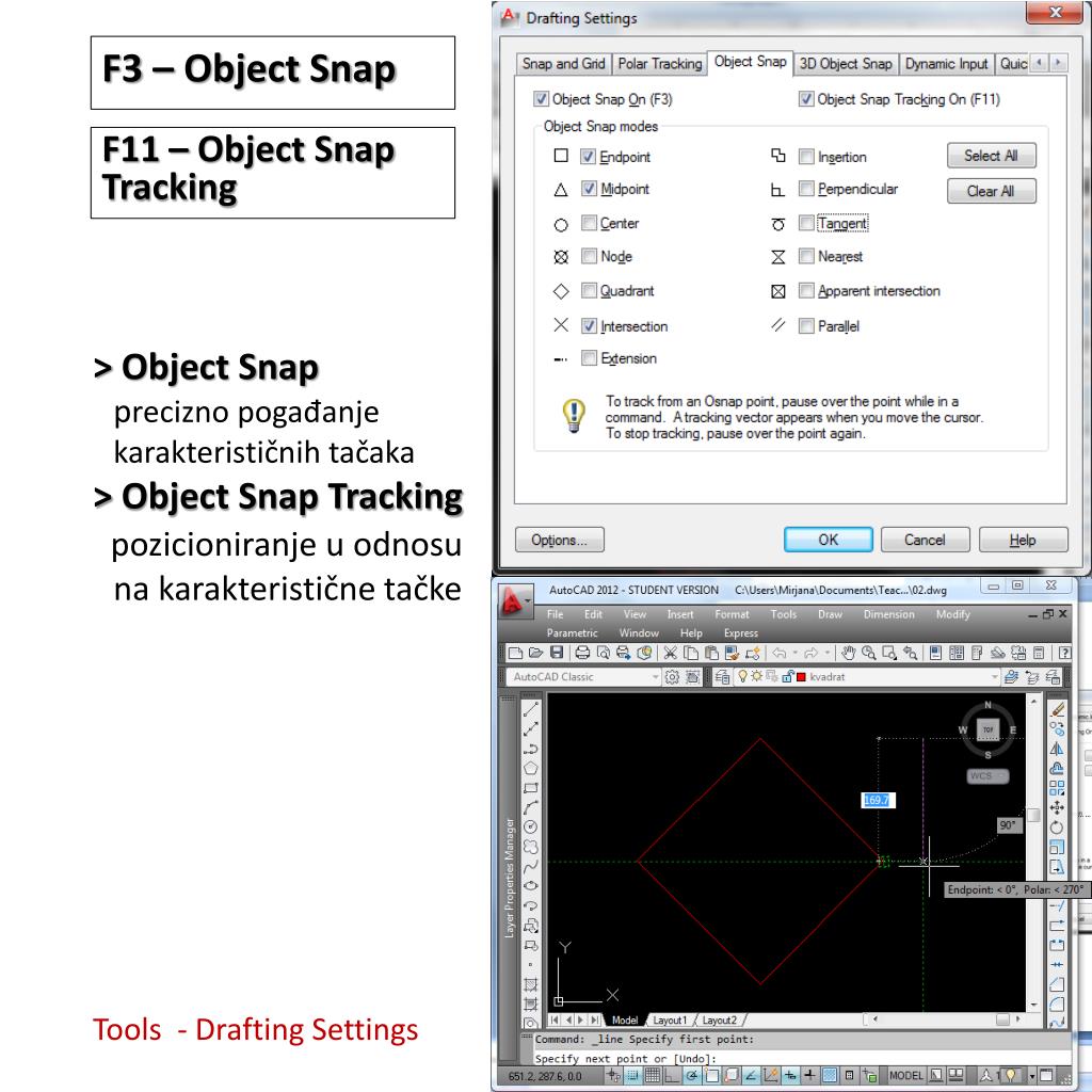 F3 – Object Snap F11 – Object Snap Tracking • > Object Snapprecizno pogađanje karakterističnih tačaka • > Object Snap Tracking • pozicioniranje u odnosu na karakteristične tačke • Tools - Drafting Settings