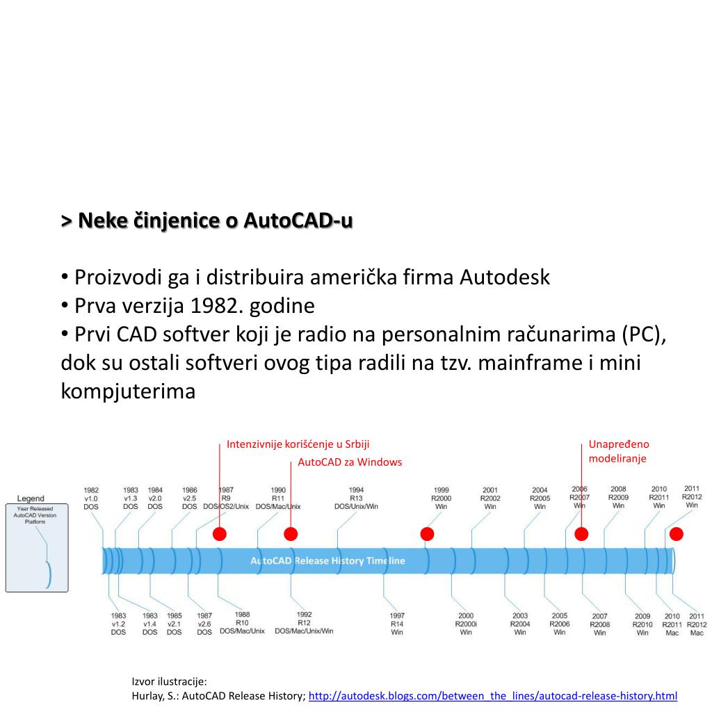 > Nekečinjenice o AutoCAD-u • Proizvodi ga i distribuira američka firma Autodesk • Prva verzija 1982. godine • Prvi CAD softver koji je radio na personalnim računarima (PC), dok su ostali softveri ovog tipa radili na tzv. mainframe i mini kompjuterima Intenzivnije korišćenje u Srbiji Unapređeno modeliranje AutoCAD za Windows Izvor ilustracije: Hurlay, S.: AutoCAD Release History; http://autodesk.blogs.com/between_the_lines/autocad-release-history.html