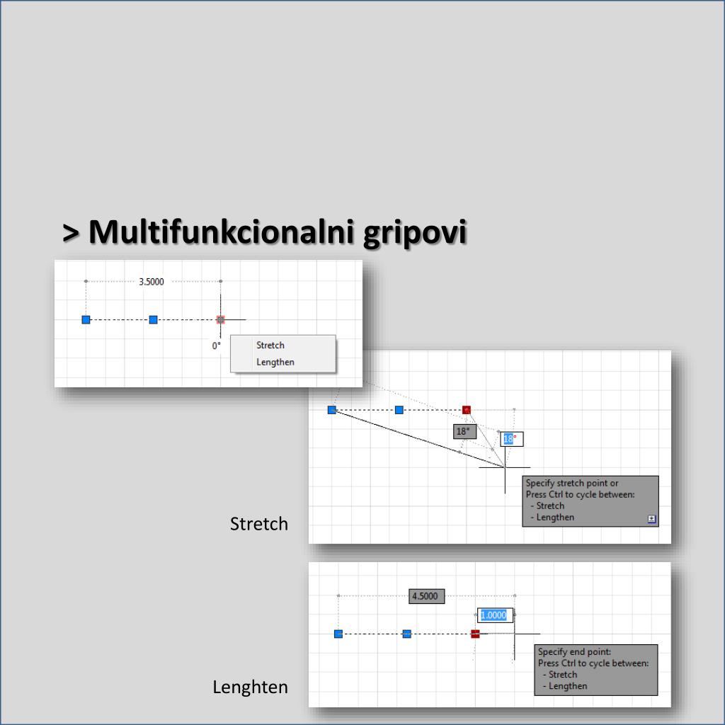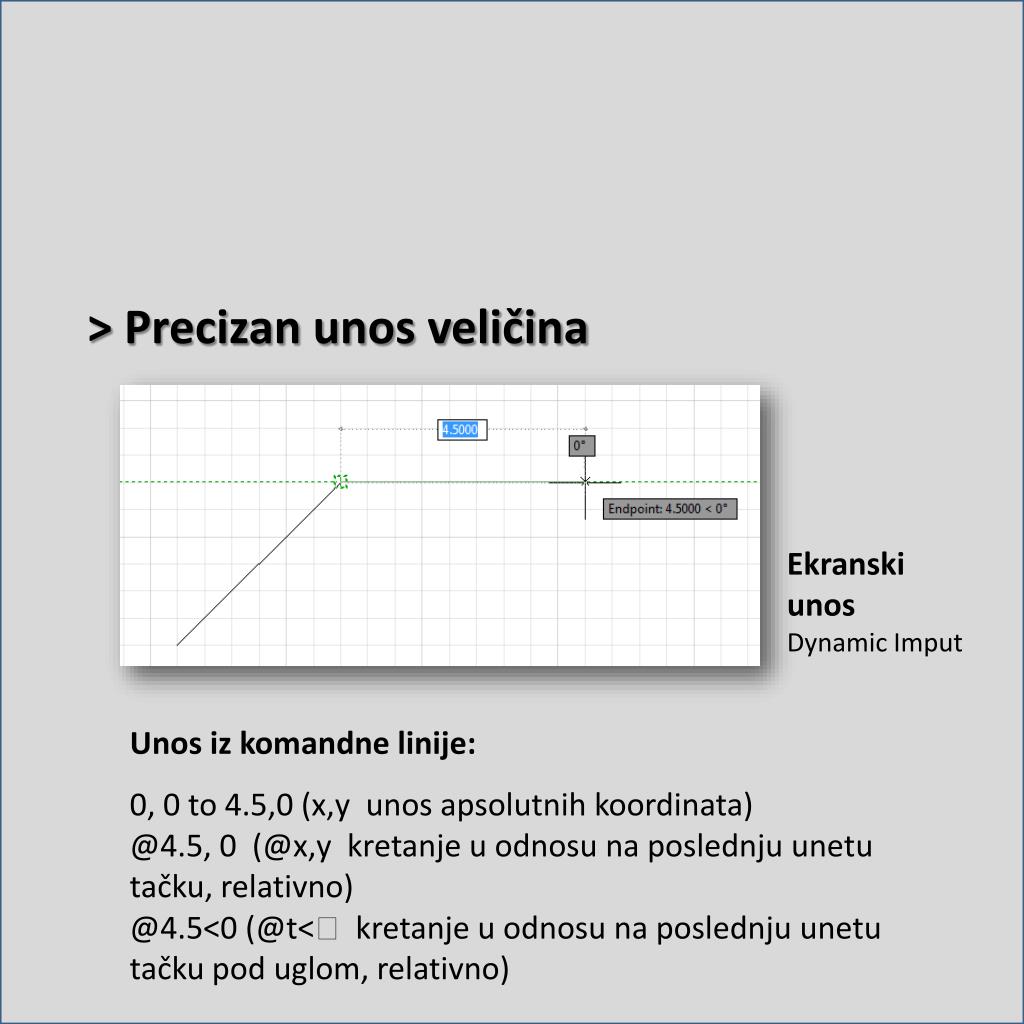 > Precizan unos veličina Ekranskiunos Dynamic Imput Unosizkomandnelinije: 0, 0 to 4.5,0 (x,yunosapsolutnihkoordinata) @4.5, 0 (@x,ykretanje u odnosunaposlednjuunetutačku, relativno) @4.5<0(@t<kretanje u odnosunaposlednjuunetutačku pod uglom, relativno)