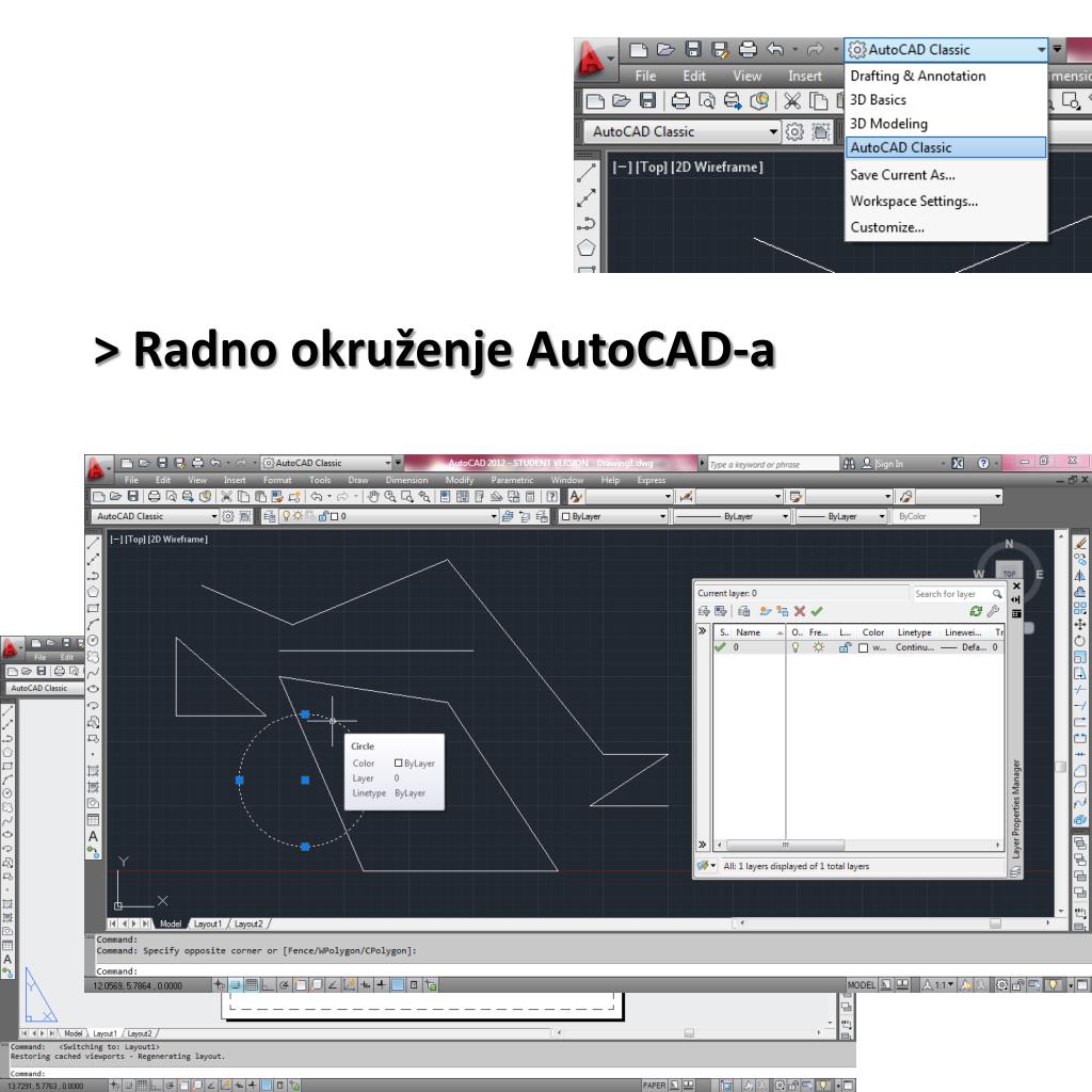 > Radno okruženje AutoCAD-a Komandna linija koordinate snap, grid, ortho, dynamic input, lineweight Model/Paper Quick view layout, quick view paper Annotation scale Workspace swithing (izgled radnog okruženja), Cleanscreen
