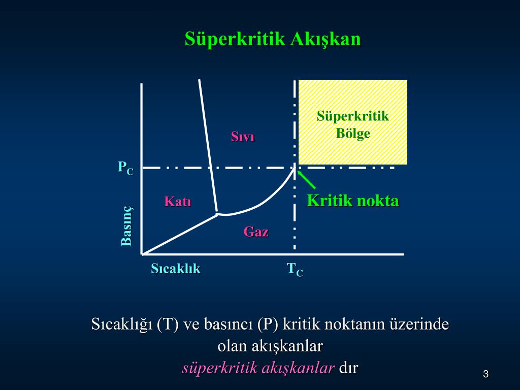 Süperkritik Bölge Sıvı PC Kritik nokta Katı Basınç Gaz Sıcaklık Süperkritik Akışkan TC Sıcaklığı (T) ve basıncı (P) kritik noktanın üzerinde olan akışkanlar süperkritik akışkanlar dır