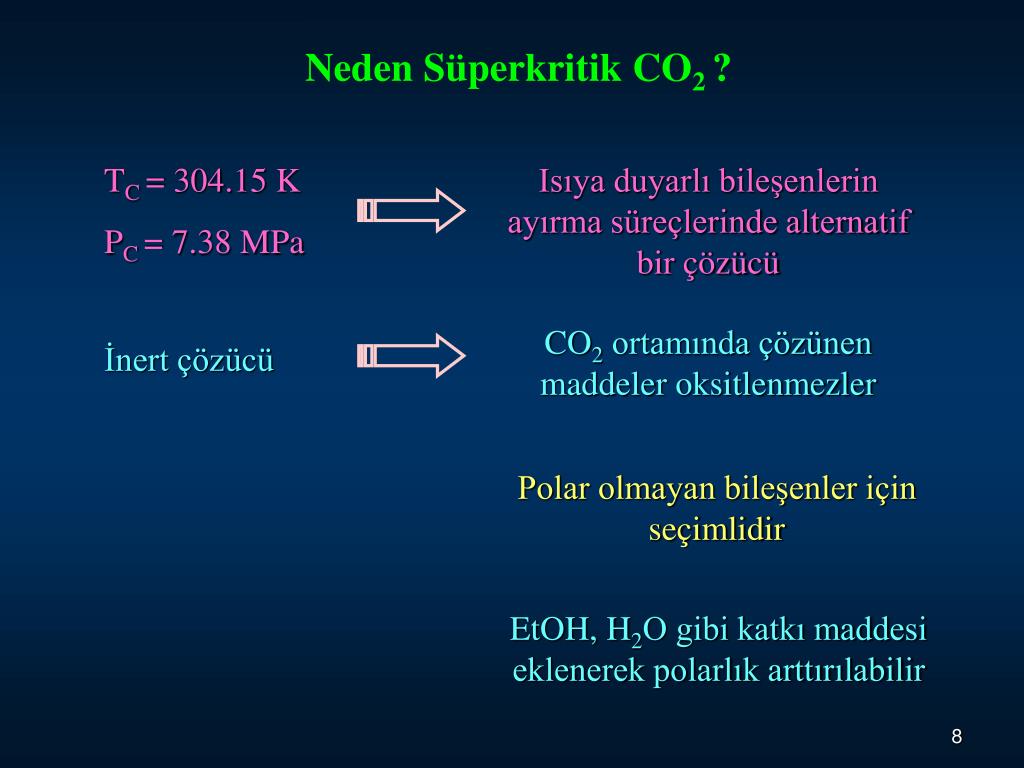 Neden Süperkritik CO2 ? TC = 304.15 K PC = 7.38 MPa Isıya duyarlı bileşenlerin ayırma süreçlerinde alternatif bir çözücü CO2 ortamında çözünen maddeler oksitlenmezler İnert çözücü Polar olmayan bileşenler için seçimlidir EtOH, H2O gibi katkı maddesi eklenerek polarlık arttırılabilir