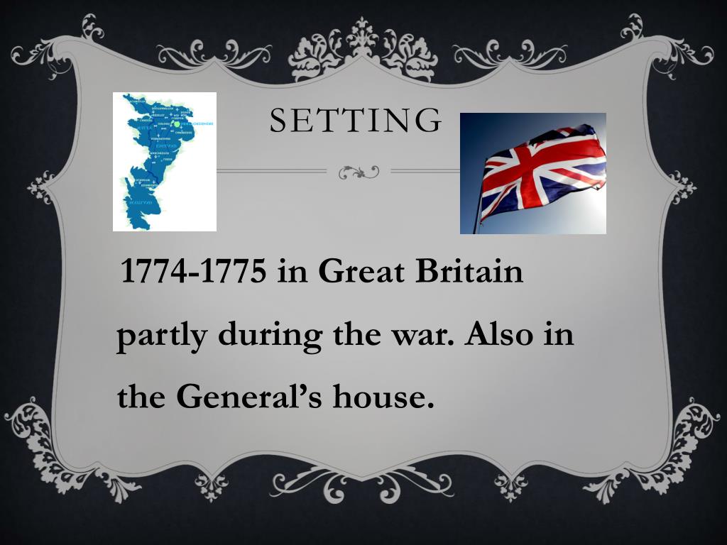 Setting 1774-1775 in Great Britain partly during the war. Also in the General’s house.