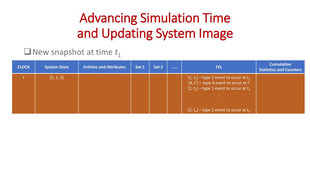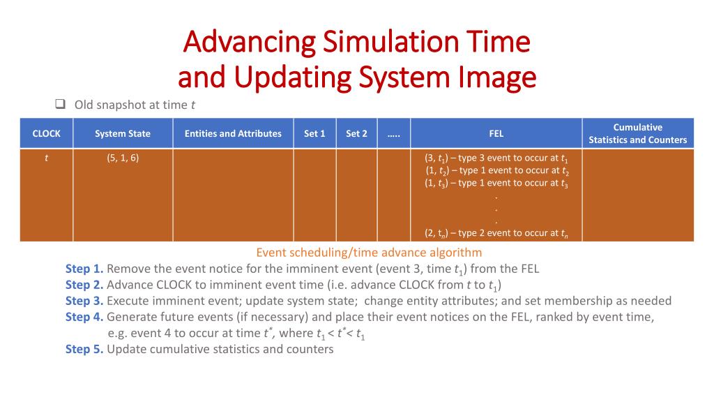Advancing Simulation Time and Updating System Image • Old snapshot at time t Event scheduling/time advance algorithm Step 1. Remove the event notice for the imminent event (event 3, time t1) from the FEL Step 2. Advance CLOCK to imminent event time (i.e. advance CLOCK from t to t1) Step 3. Execute imminent event; update system state; change entity attributes; and set membership as needed Step 4. Generate future events (if necessary) and place their event notices on the FEL, ranked by event time, e.g. event 4 to occur at time t*, where t1 < t*< t1 Step 5. Update cumulative statistics and counters