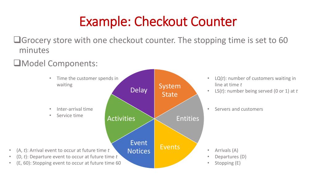 Example: Checkout Counter • Grocery store with one checkout counter. The stopping time is set to 60 minutes • Model Components: • Time the customer spends in waiting • LQ(t): number of customers waiting in line at time t • LS(t): number being served (0 or 1) at t • Inter-arrival time • Service time • Servers and customers • (A, t): Arrival event to occur at future time t • (D, t): Departure event to occur at future time t • (E, 60): Stopping event to occur at future time 60 • Arrivals (A) • Departures (D) • Stopping (E)