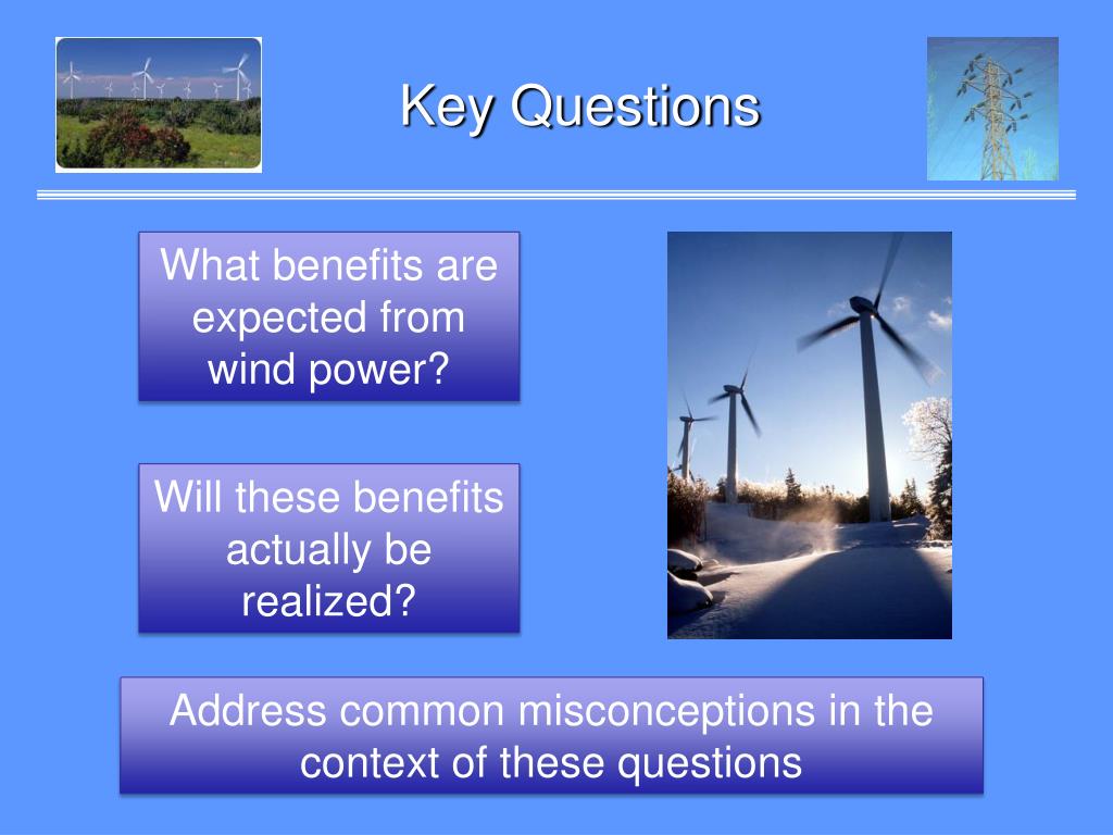Key Questions What benefits are expected from wind power? Will these benefits actually be realized? Address common misconceptions in the context of these questions