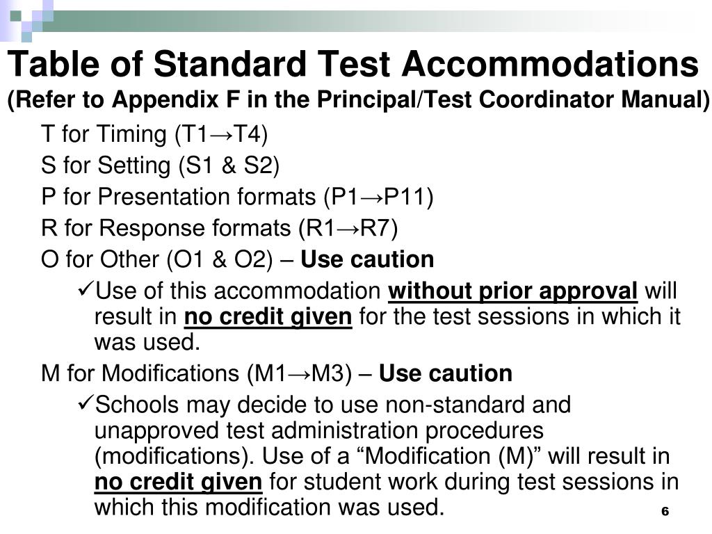 Table of Standard Test Accommodations(Refer to Appendix F in the Principal/Test Coordinator Manual) T for Timing (T1→T4) S for Setting (S1 & S2) P for Presentation formats (P1→P11) R for Response formats (R1→R7) O for Other (O1 & O2) – Use caution • Use of this accommodation without prior approval will result in no credit given for the test sessions in which it was used. M for Modifications (M1→M3) – Use caution • Schools may decide to use non-standard and unapproved test administration procedures (modifications). Use of a “Modification (M)” will result in no credit given for student work during test sessions in which this modification was used.