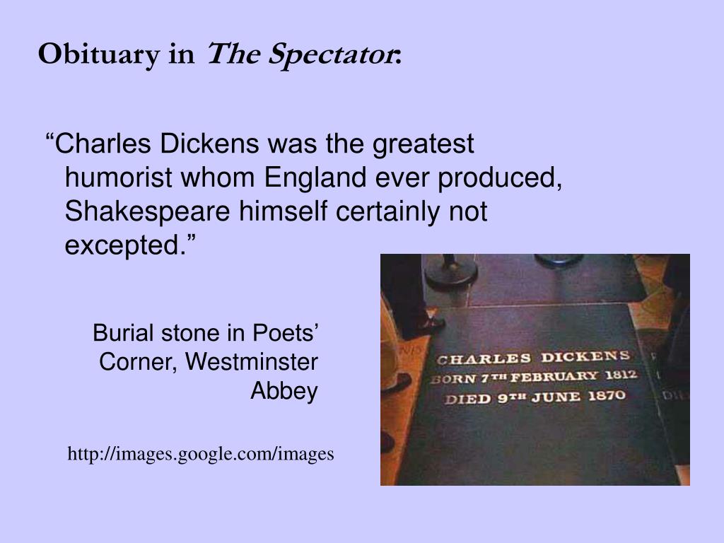 http://images.google.com/images Obituary in The Spectator: “Charles Dickens was the greatest humorist whom England ever produced, Shakespeare himself certainly not excepted.” Burial stone in Poets’ Corner, Westminster Abbey