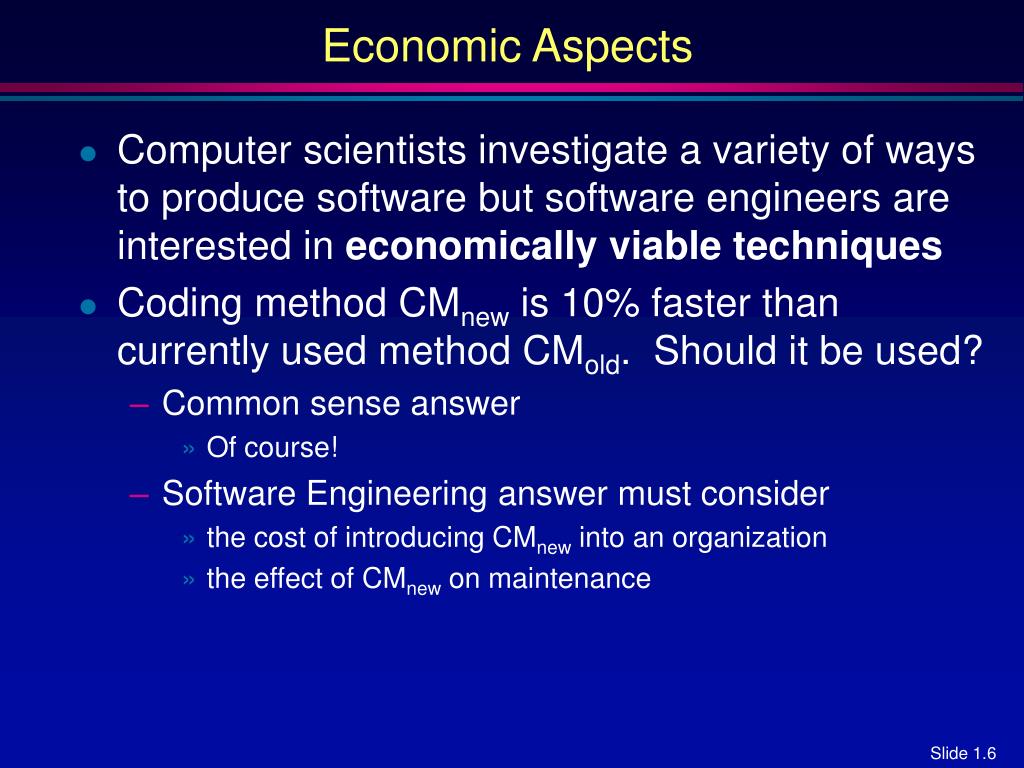 Economic Aspects • Computer scientists investigate a variety of ways to produce software but software engineers are interested in economically viable techniques • Coding method CMnew is 10% faster than currently used method CMold. Should it be used? • Common sense answer • Of course! • Software Engineering answer must consider • the cost of introducing CMnew into an organization • the effect of CMnew on maintenance