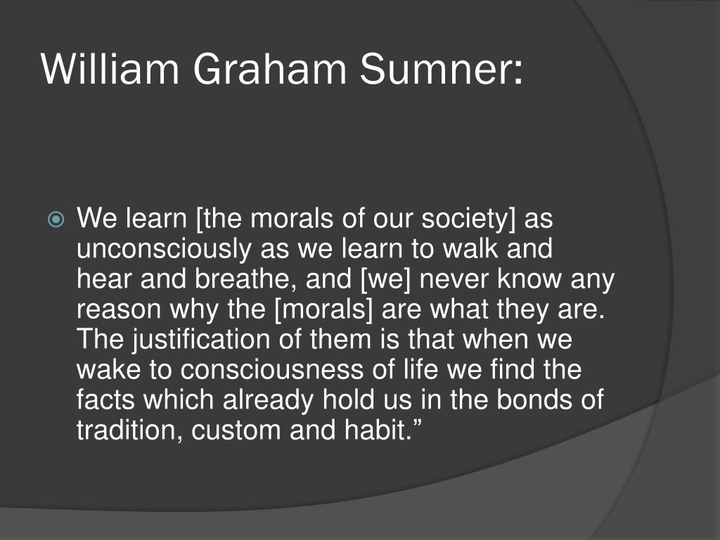William Graham Sumner: • We learn [the morals of our society] as unconsciously as we learn to walk and hear and breathe, and [we] never know any reason why the [morals] are what they are. The justification of them is that when we wake to consciousness of life we find the facts which already hold us in the bonds of tradition, custom and habit.”