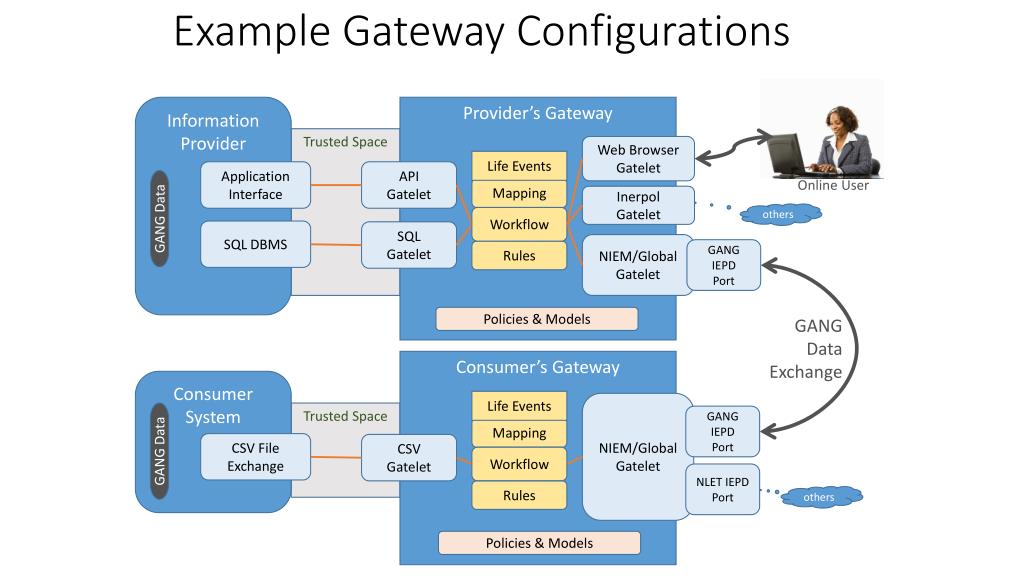 Example Gateway Configurations Information Provider Provider’s Gateway Trusted Space Web Browser Gatelet Life Events Application Interface API Gatelet Online User Mapping Inerpol Gatelet others Workflow GANG Data SQL DBMS SQL Gatelet NIEM/Global Gatelet GANG IEPD Port Rules Policies & Models GANG DataExchange Consumer’s Gateway Consumer System Life Events NIEM/Global Gatelet Trusted Space GANG IEPD Port Mapping CSV File Exchange CSV Gatelet GANG Data Workflow NLET IEPD Port Rules others Policies & Models