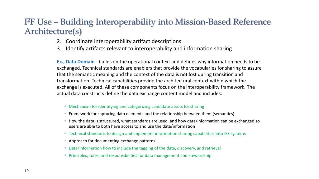 I2F Use – Building Interoperability into Mission-Based Reference Architecture(s) • Coordinate interoperability artifact descriptions • Identify artifacts relevant to interoperability and information sharing • Ex., Data Domain - builds on the operational context and defines why information needs to be exchanged. Technical standards are enablers that provide the vocabularies for sharing to assure that the semantic meaning and the context of the data is not lost during transition and transformation. Technical capabilities provide the architectural context within which the exchange is executed. All of these components focus on the interoperability framework. The actual data constructs define the data exchange content model and includes: • Mechanism for identifying and categorizing candidate assets for sharing • Framework for capturing data elements and the relationship between them (semantics) • How the data is structured, what standards are used, and how data/information can be exchanged so users are able to both have access to and use the data/information • Technical standards to design and implement information sharing capabilities into ISE systems • Approach for documenting exchange patterns • Data/information flow to include the tagging of the data, discovery, and retrieval • Principles, roles, and responsibilities for data management and stewardship