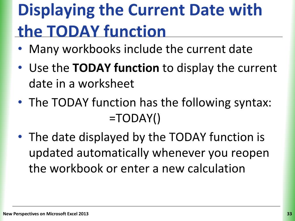 Displaying the Current Date with the TODAY function • Many workbooks include the current date • Use the TODAY function to display the current date in a worksheet • The TODAY function has the following syntax: =TODAY() • The date displayed by the TODAY function is updated automatically whenever you reopen the workbook or enter a new calculation New Perspectives on Microsoft Excel 2013