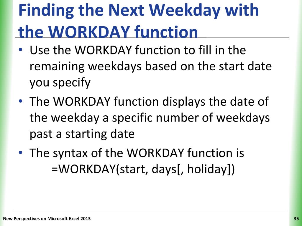 Finding the Next Weekday with the WORKDAY function • Use the WORKDAY function to fill in the remaining weekdays based on the start date you specify • The WORKDAY function displays the date of the weekday a specific number of weekdays past a starting date • The syntax of the WORKDAY function is =WORKDAY(start, days[, holiday]) New Perspectives on Microsoft Excel 2013