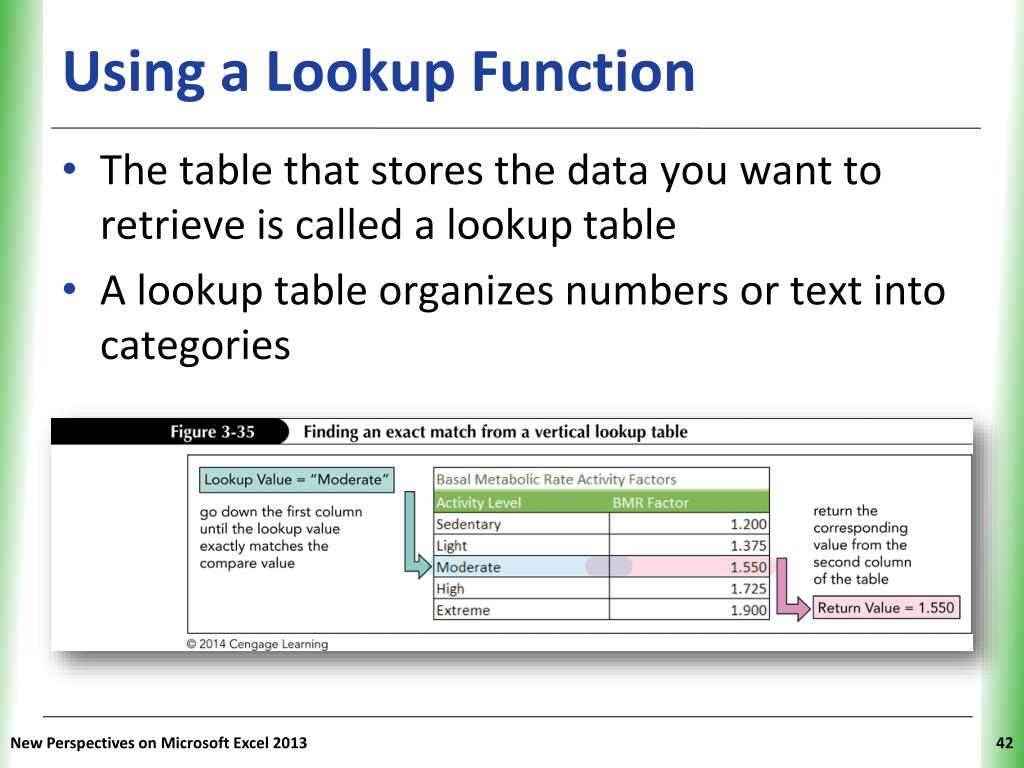 Using a Lookup Function • The table that stores the data you want to retrieve is called a lookup table • A lookup table organizes numbers or text into categories New Perspectives on Microsoft Excel 2013