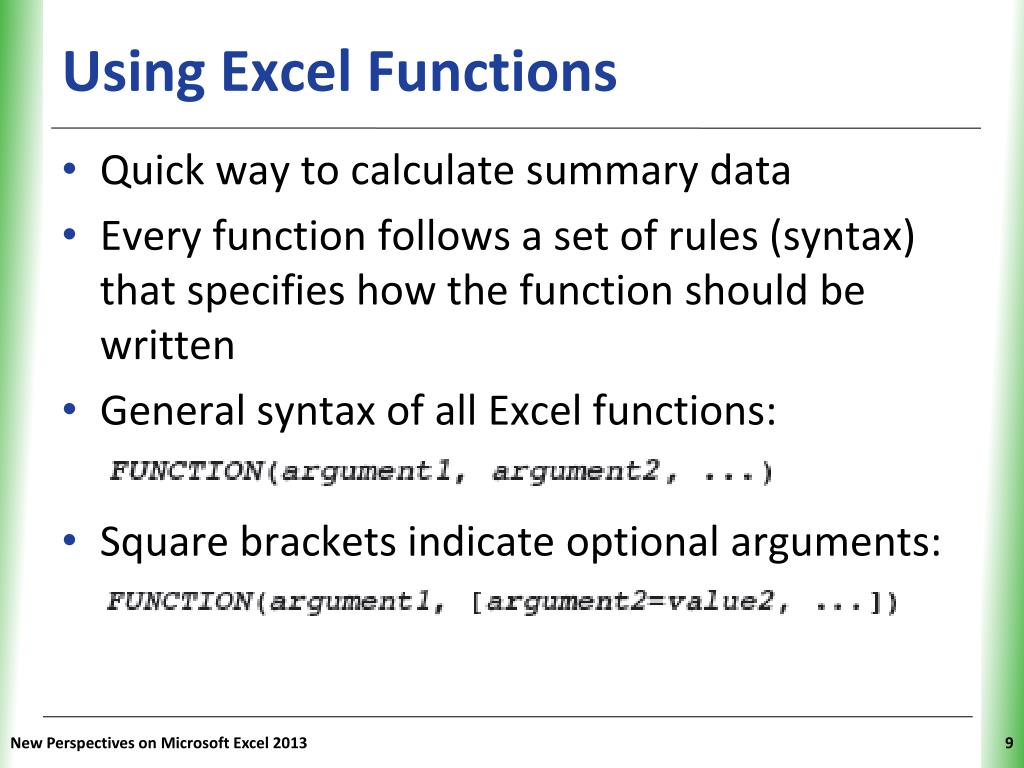 Using Excel Functions Quick way to calculate summary data Every function follows a set of rules (syntax) that specifies how the function should be written General syntax of all Excel functions: Square brackets indicate optional arguments: New Perspectives on Microsoft Excel 2013